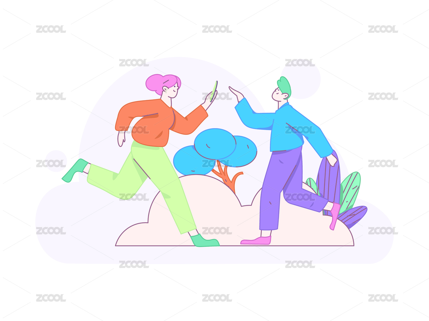 植物从中行走的情侣插画