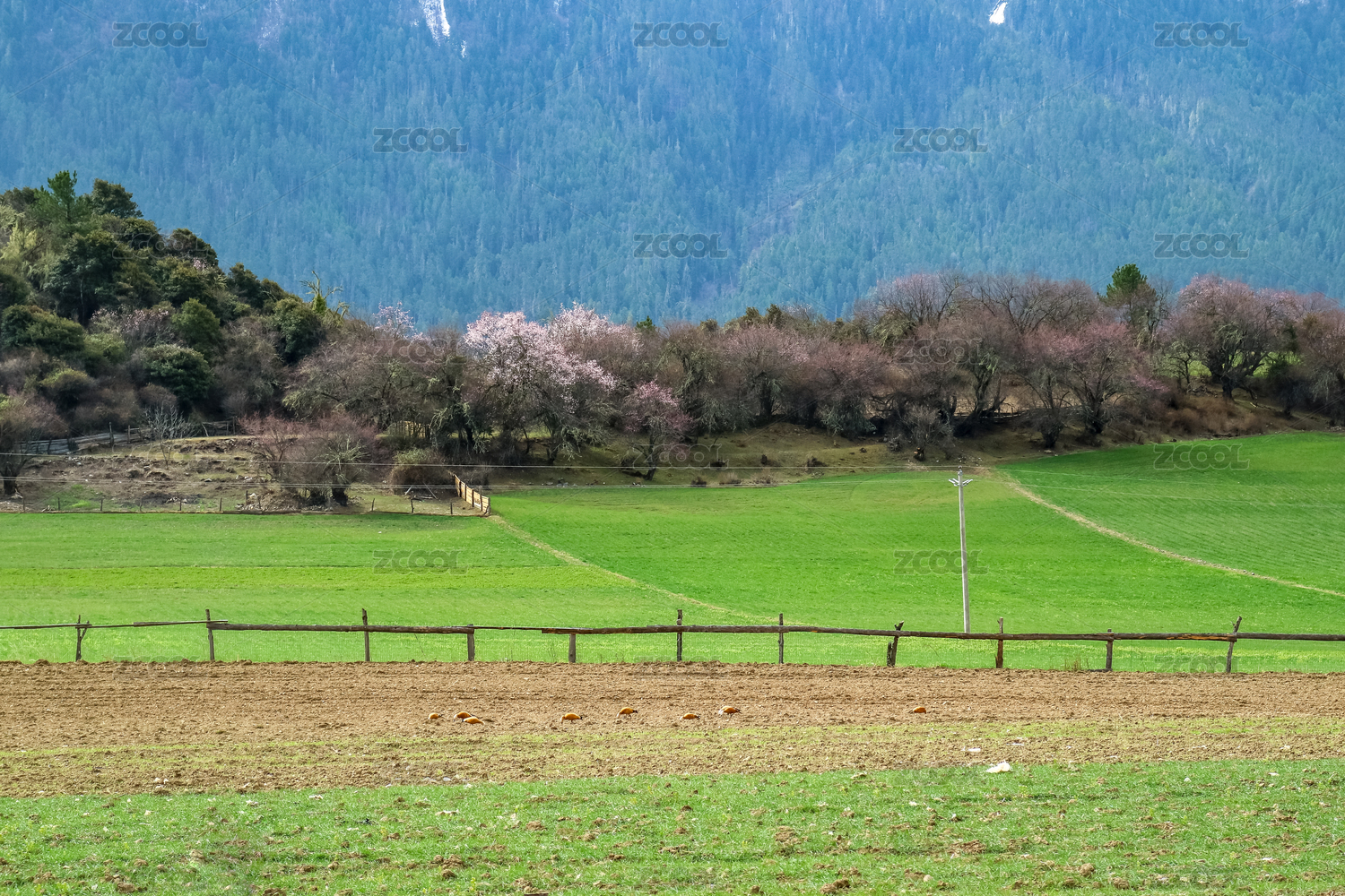 中国西藏林芝波密春天桃花雪山田野