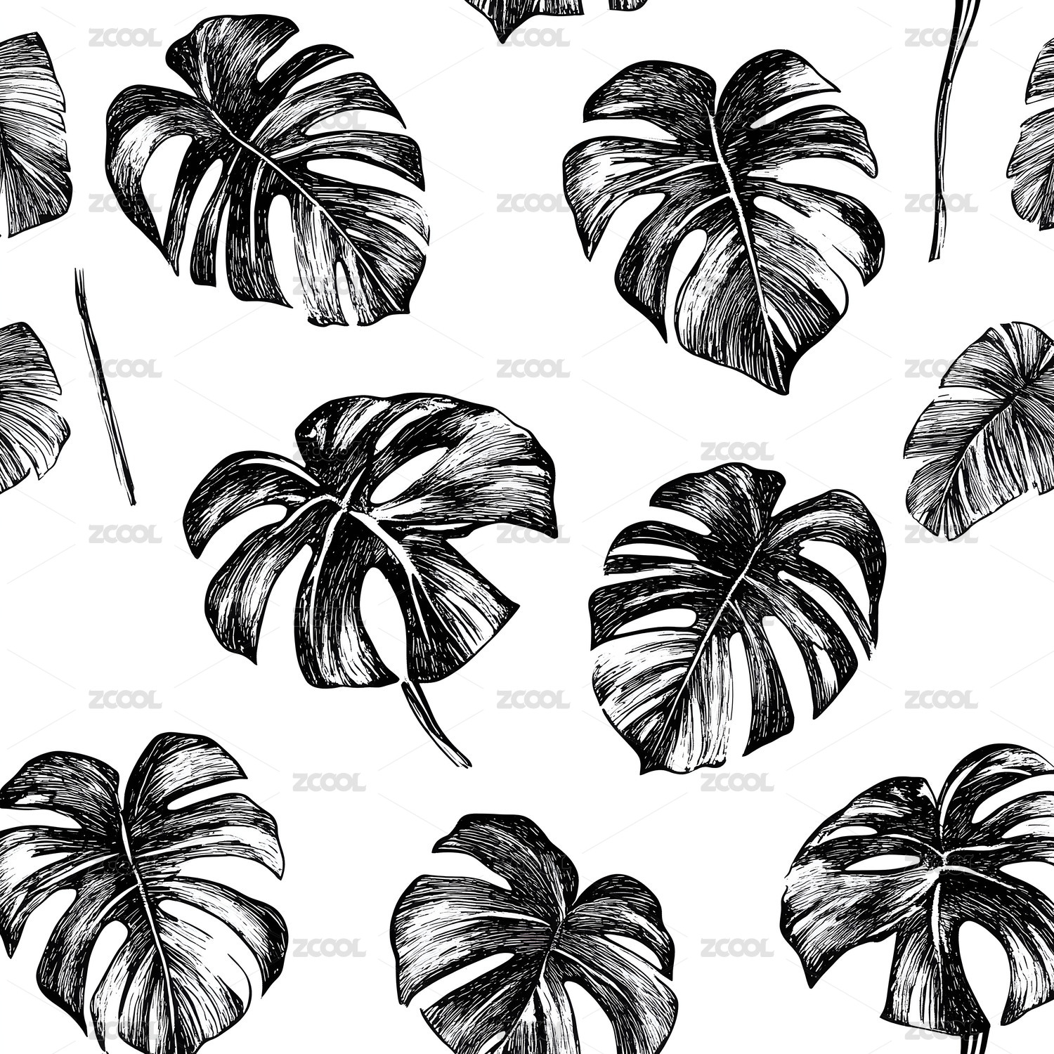 黑白热带花和叶素材印花图案壁纸