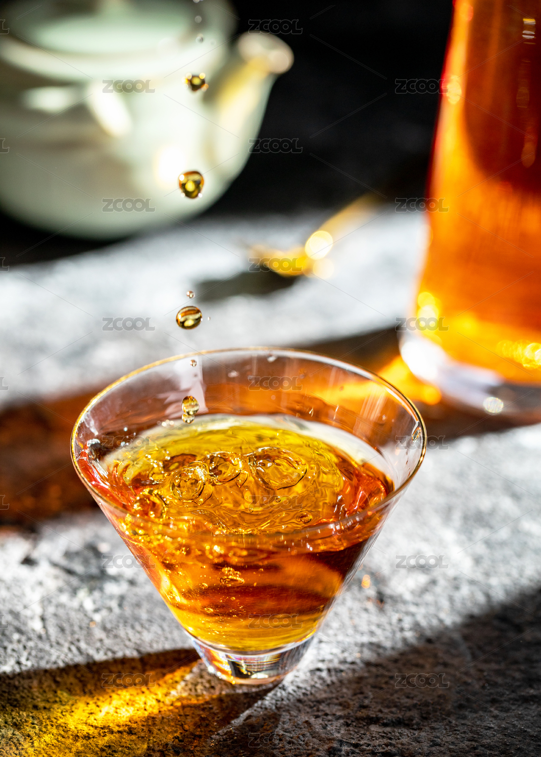 一杯加有冰块的洋酒与扁平酒瓶特写