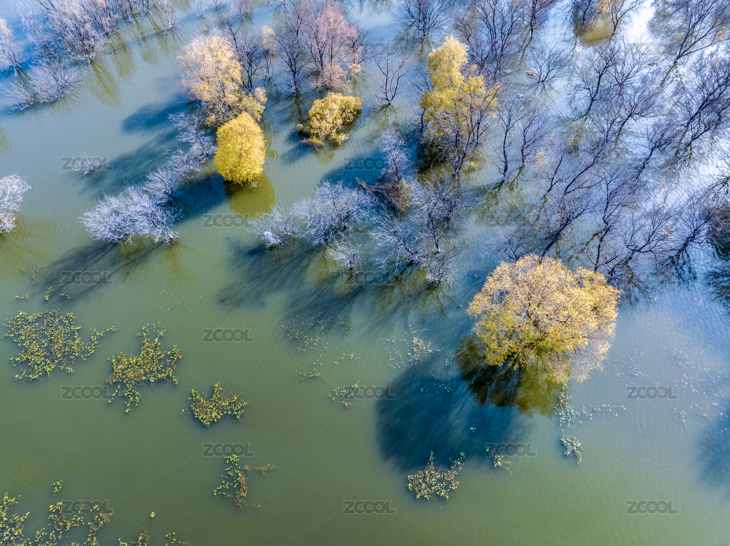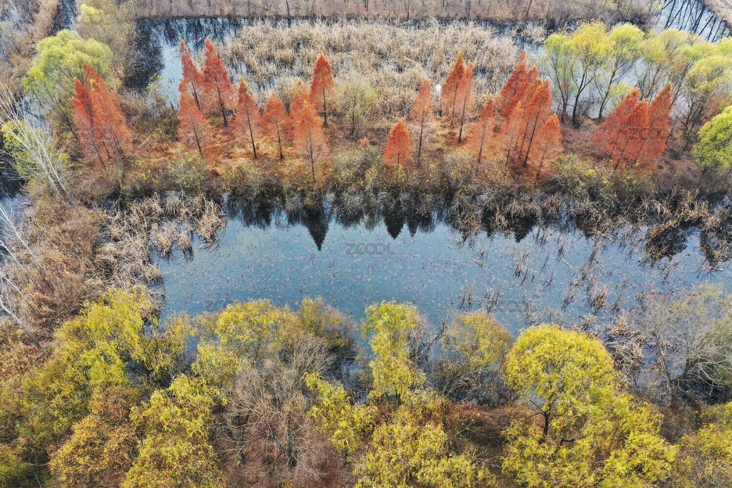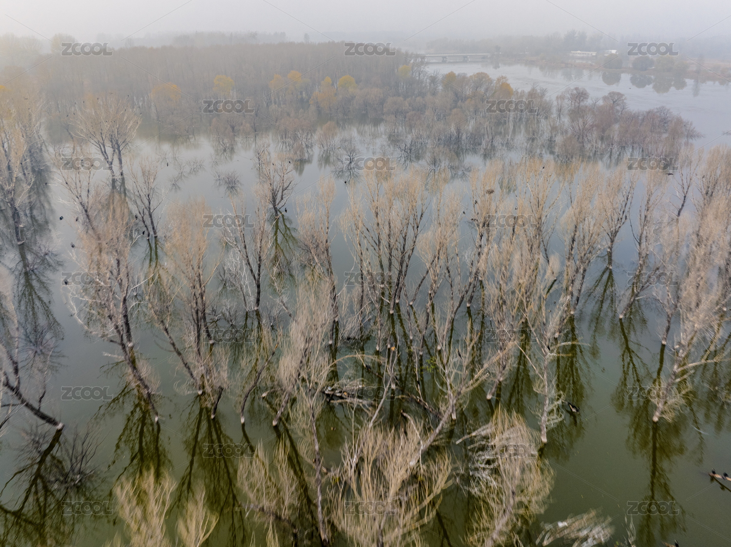 漳泽湖湿地公园,航拍,秋日,雾,倒影,全景,树木