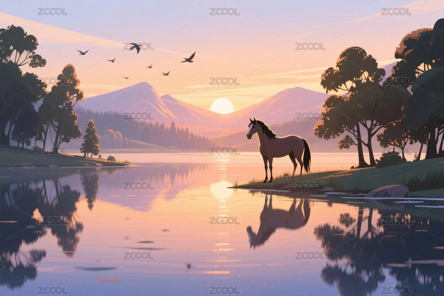 湖畔马与夕阳风景