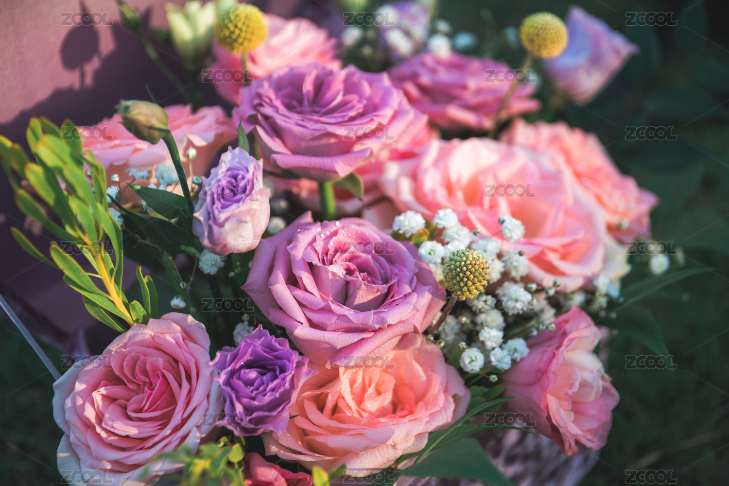 鲜艳美丽的粉色百合花和白玫瑰花
