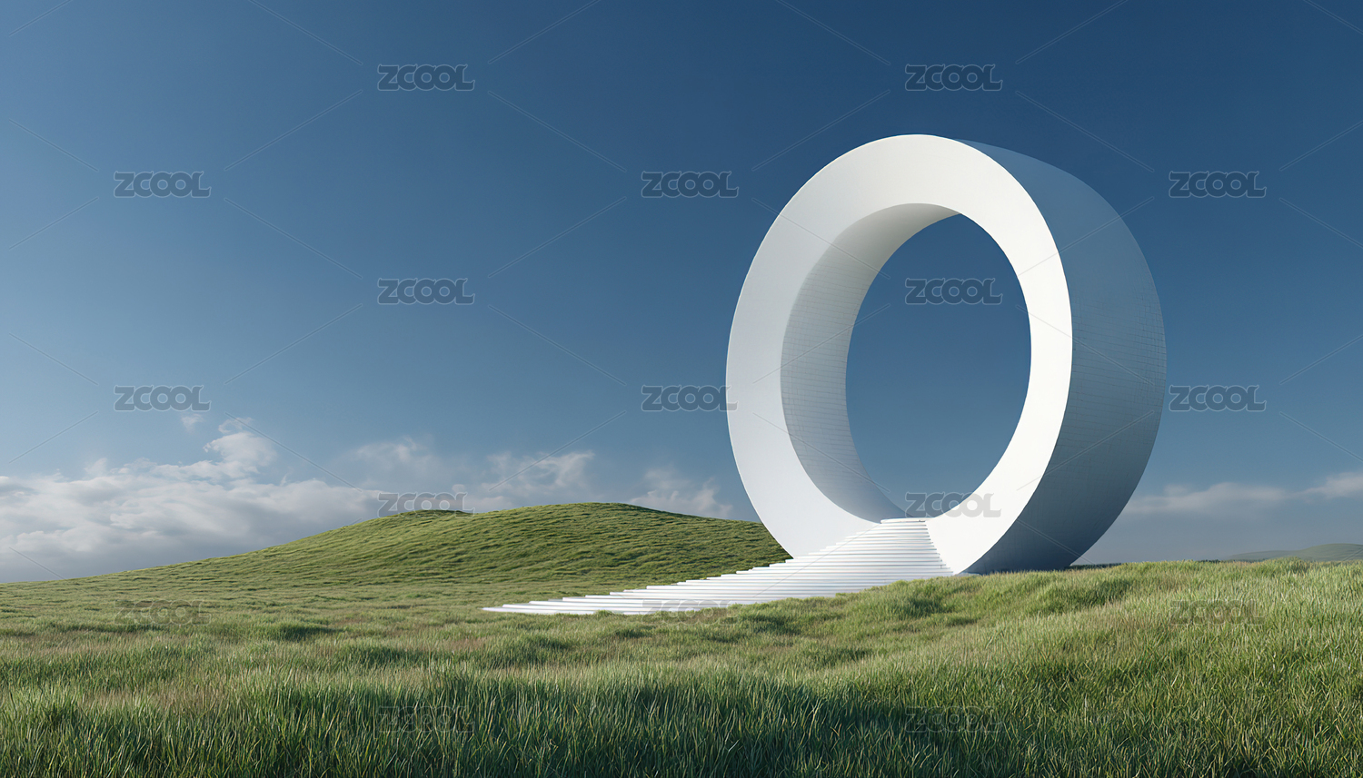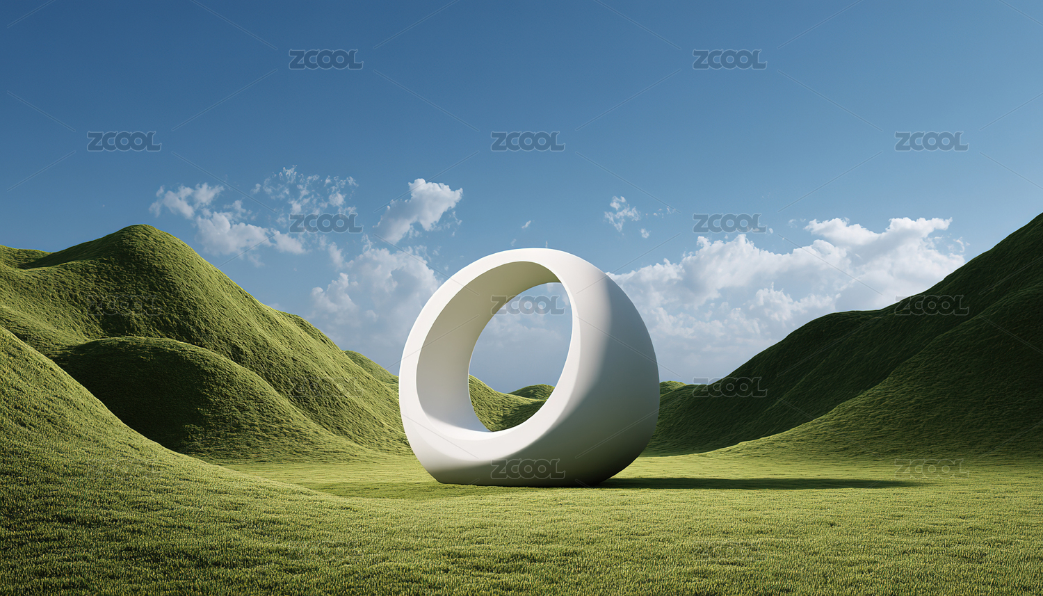 绿色丘陵上的白色环形雕塑