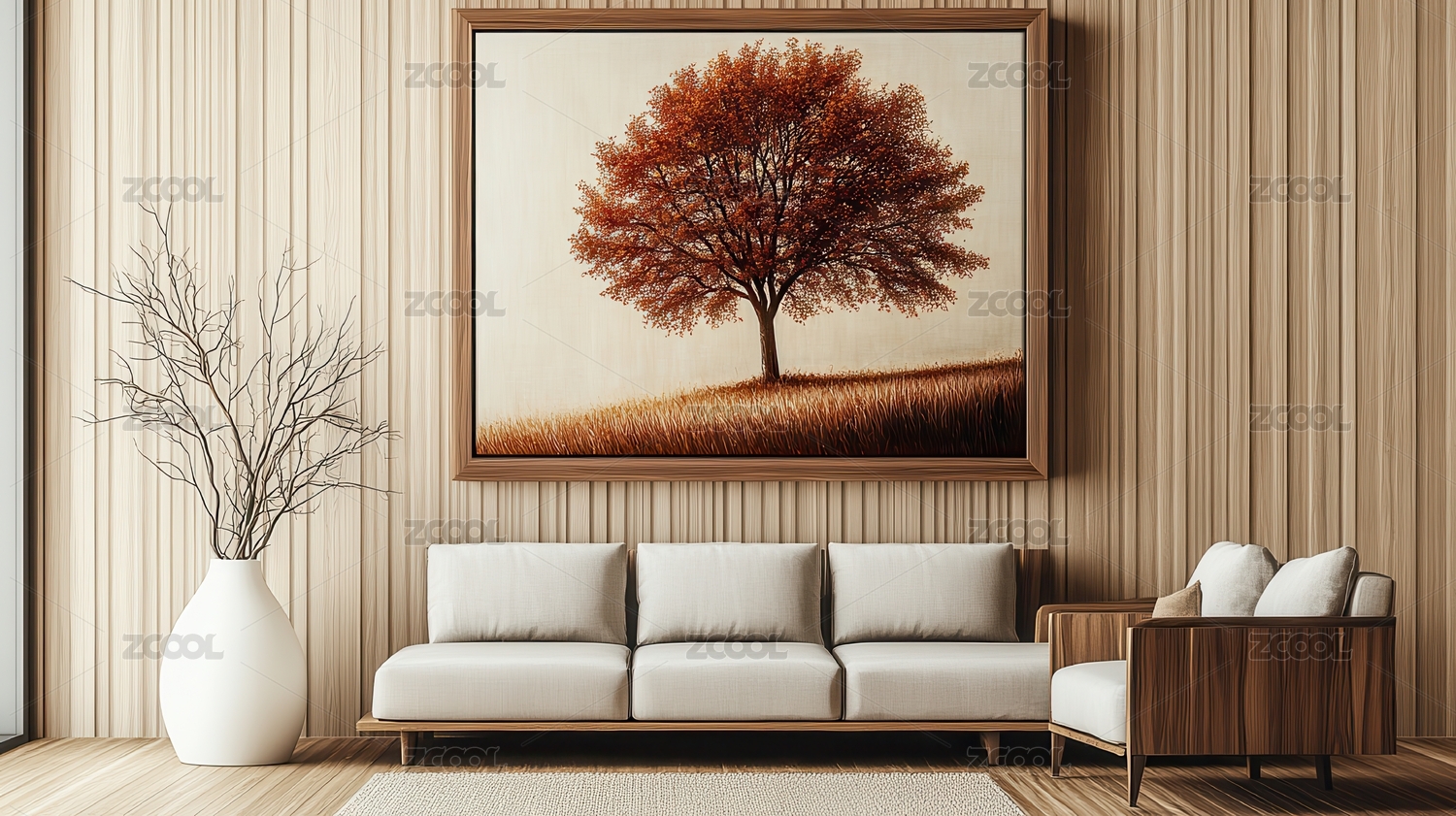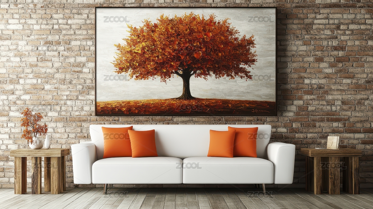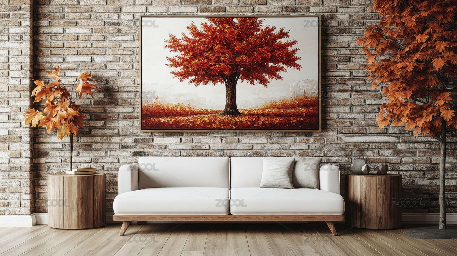 客厅,沙发,装饰画,秋叶,温馨,舒适,家居,自然,宁静,室内设计