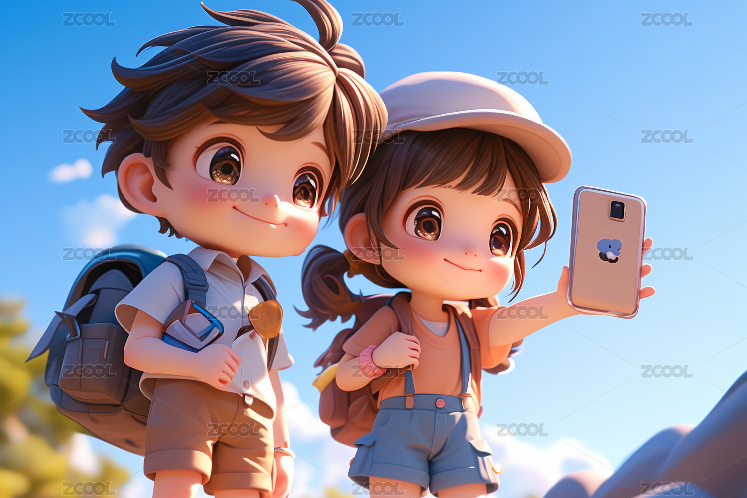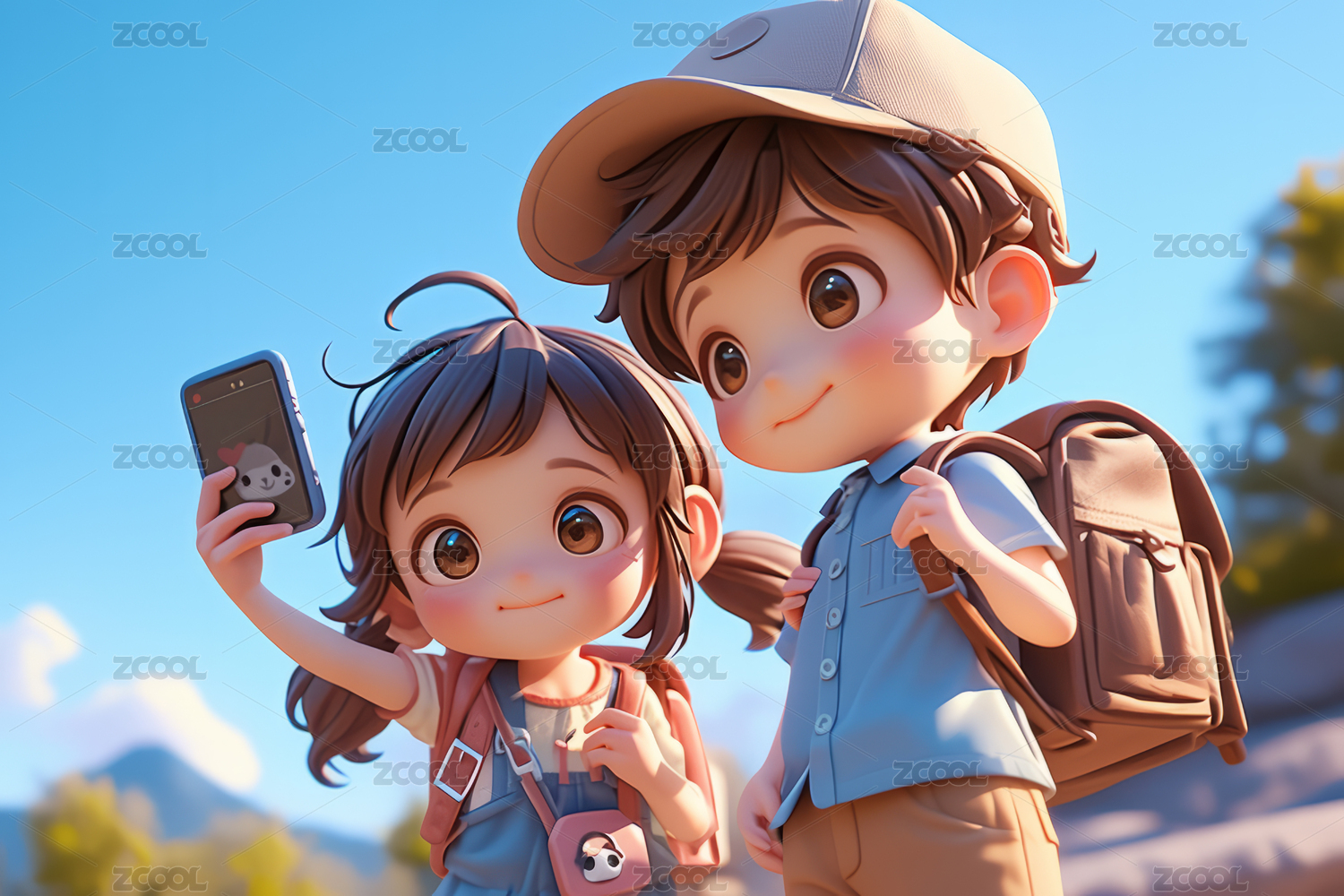 户外拿手机自拍的情侣卡通3D