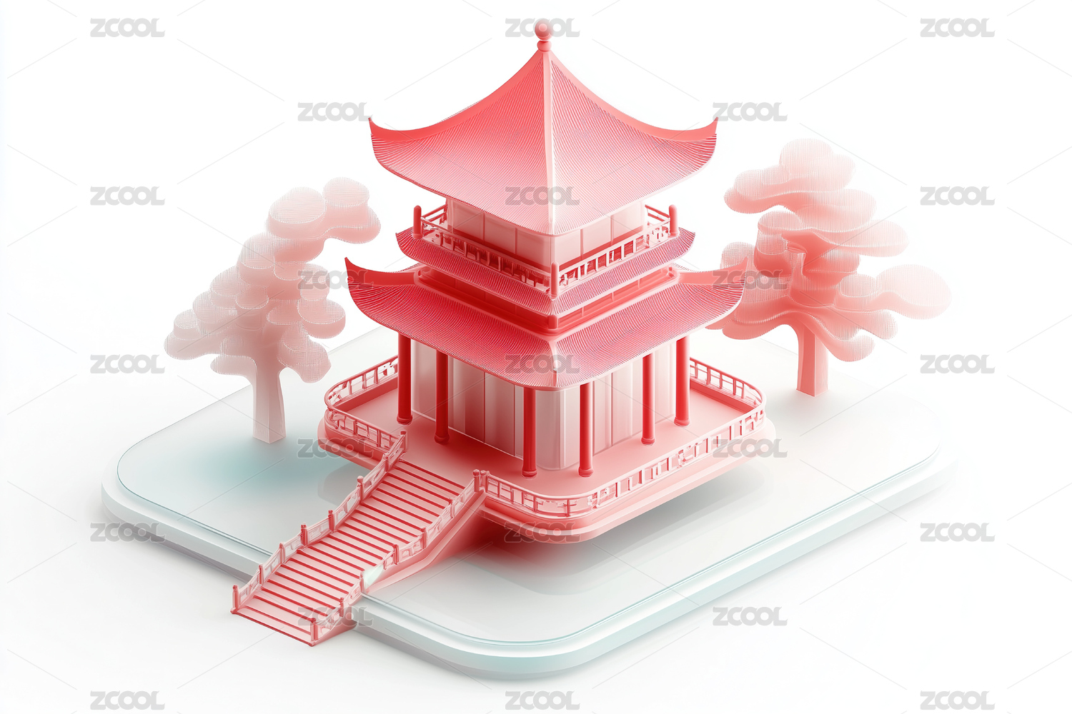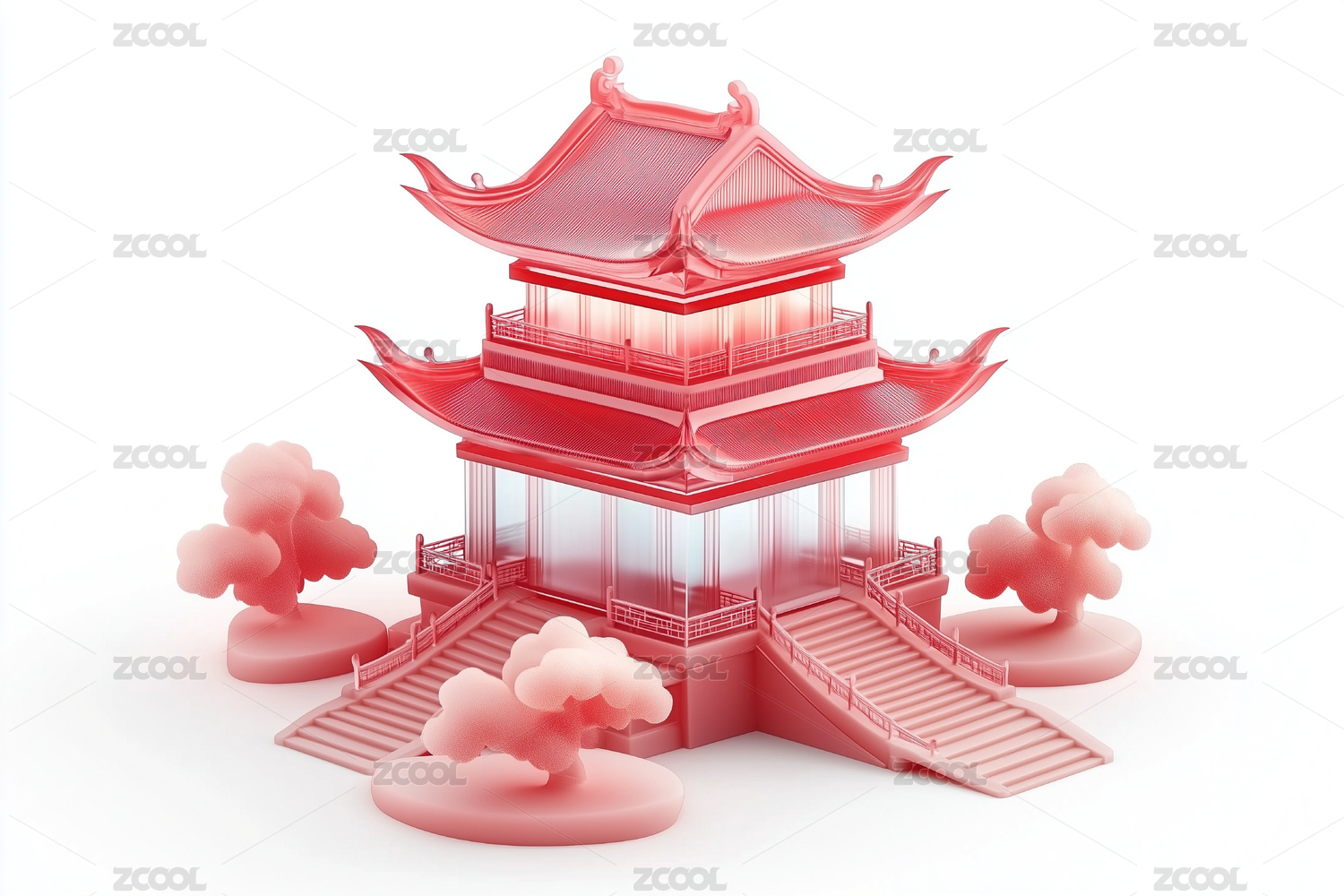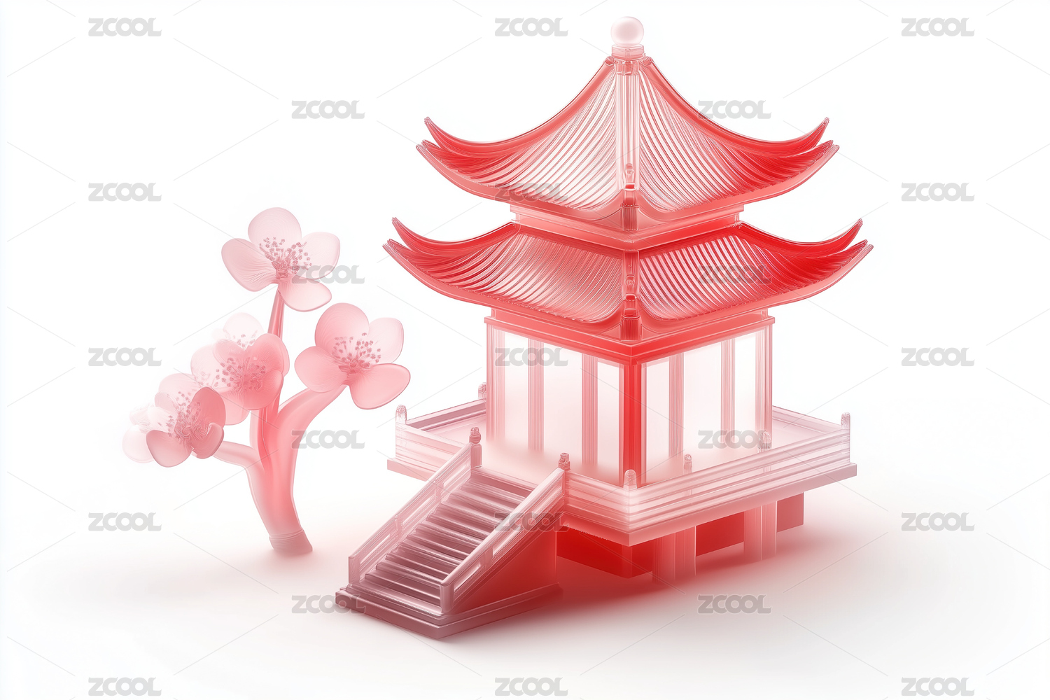 中国风,建筑,模型,微缩景观,中式庭院,粉红色,古建筑,园林,樱花,树木