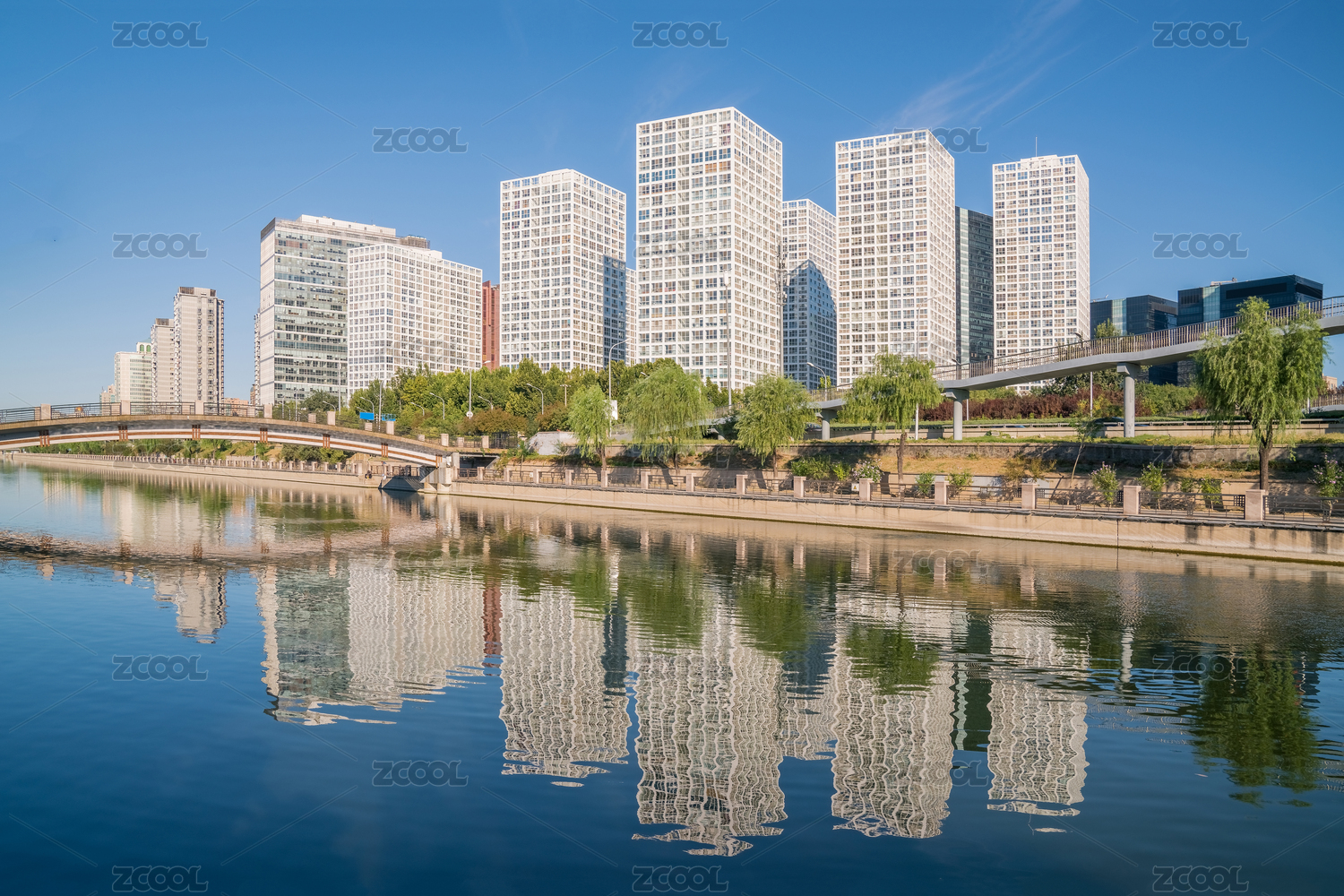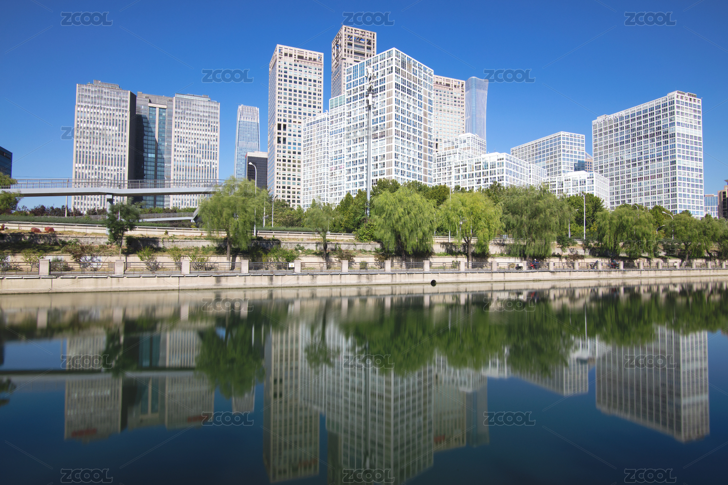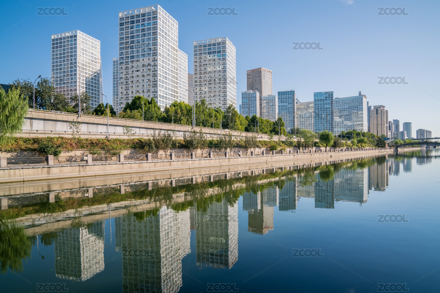 中国北京现代城市建筑与清澈的河流水面倒影
