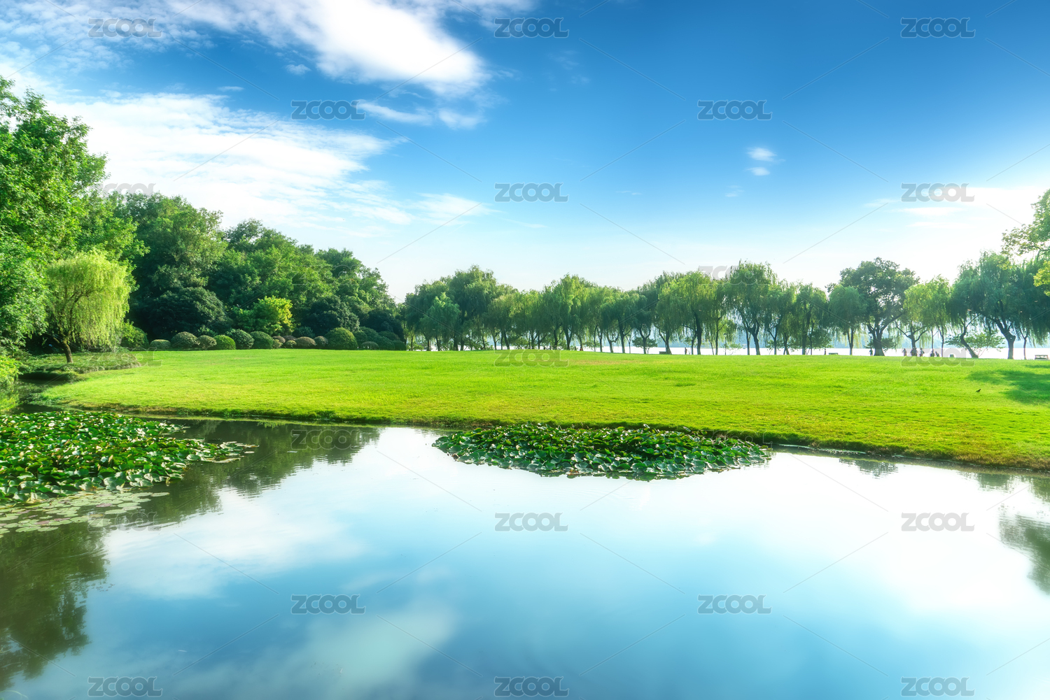 公园草地湖泊绿树林