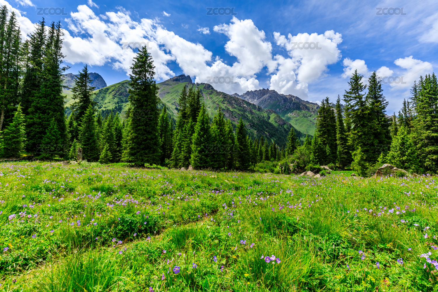 中国新疆下塔风景区鲜艳的花朵和绿色的大山
