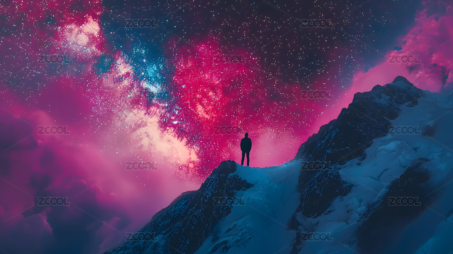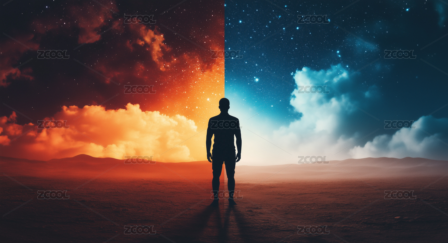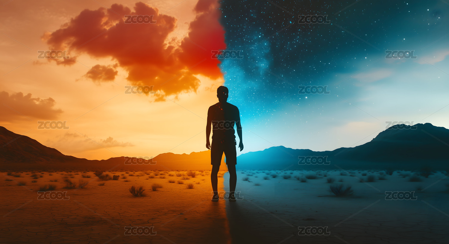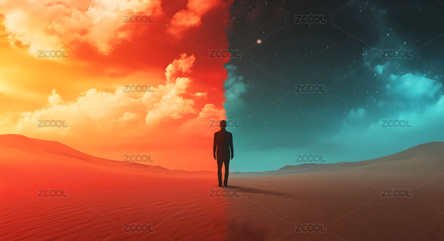 梦幻,沙漠, 日落, 星空, 夜晚, 交替, 孤独, 人影, 沙丘, 云彩