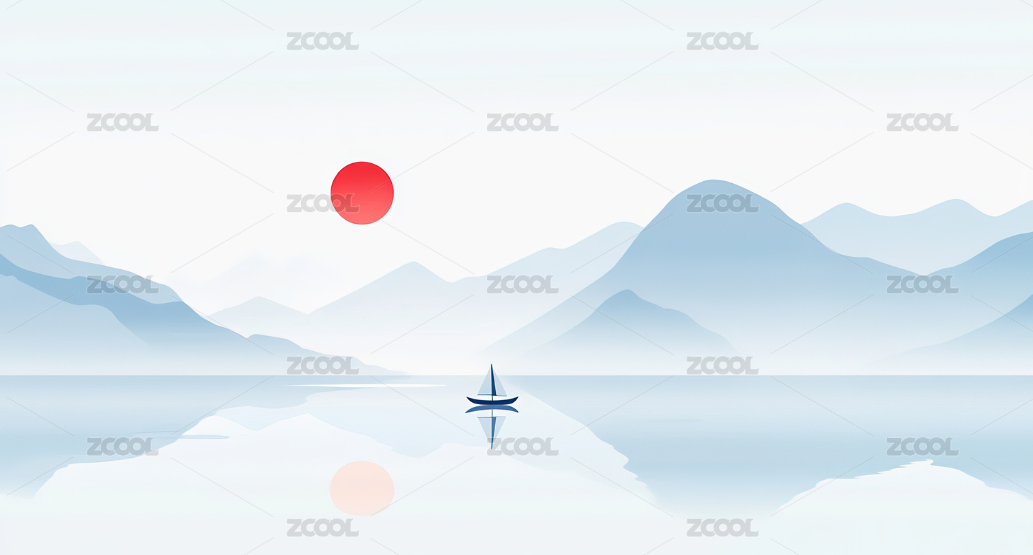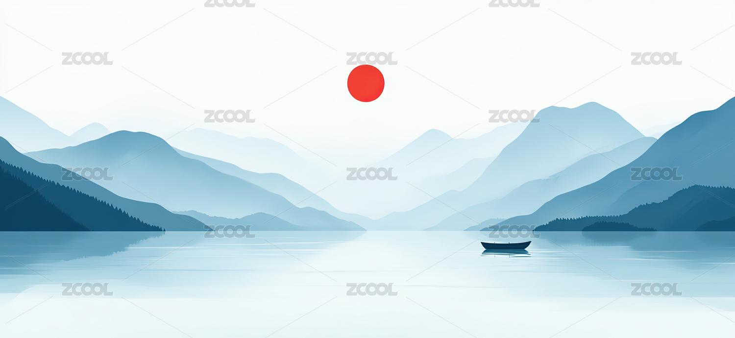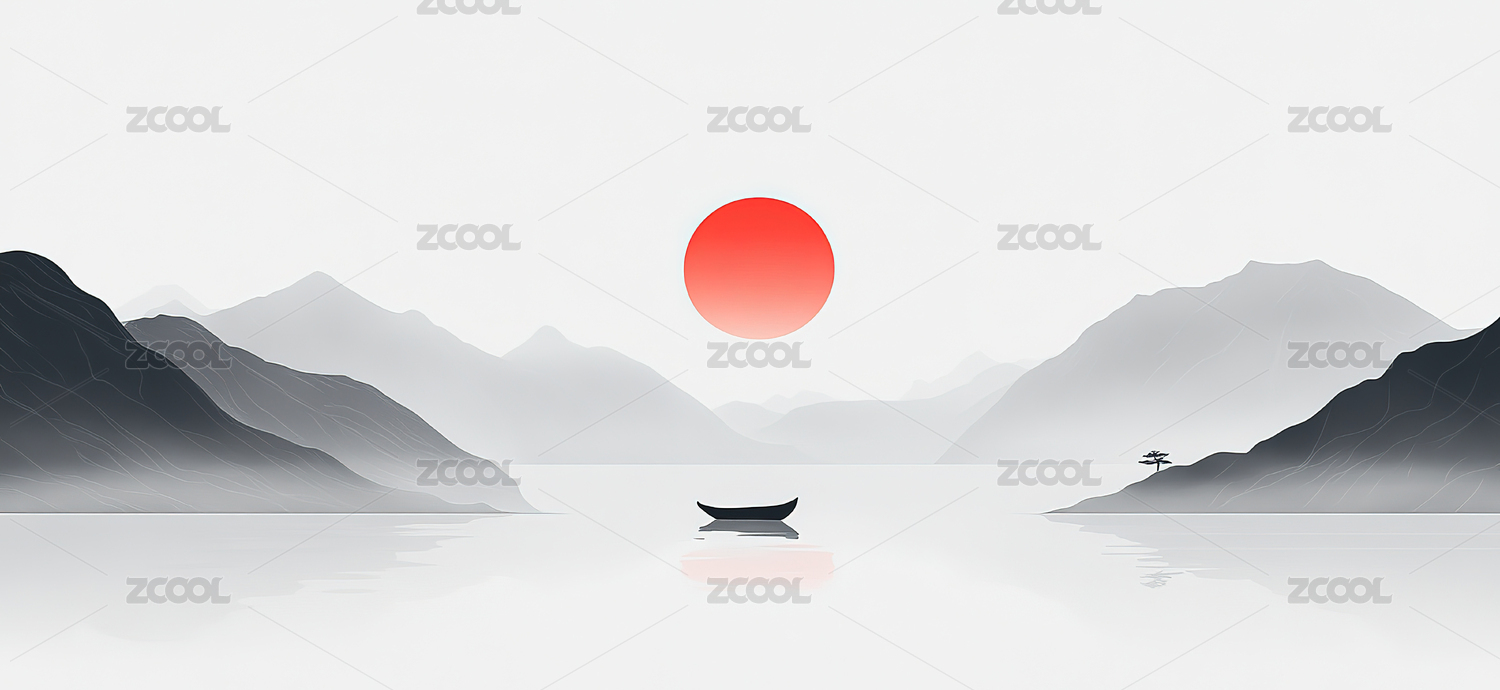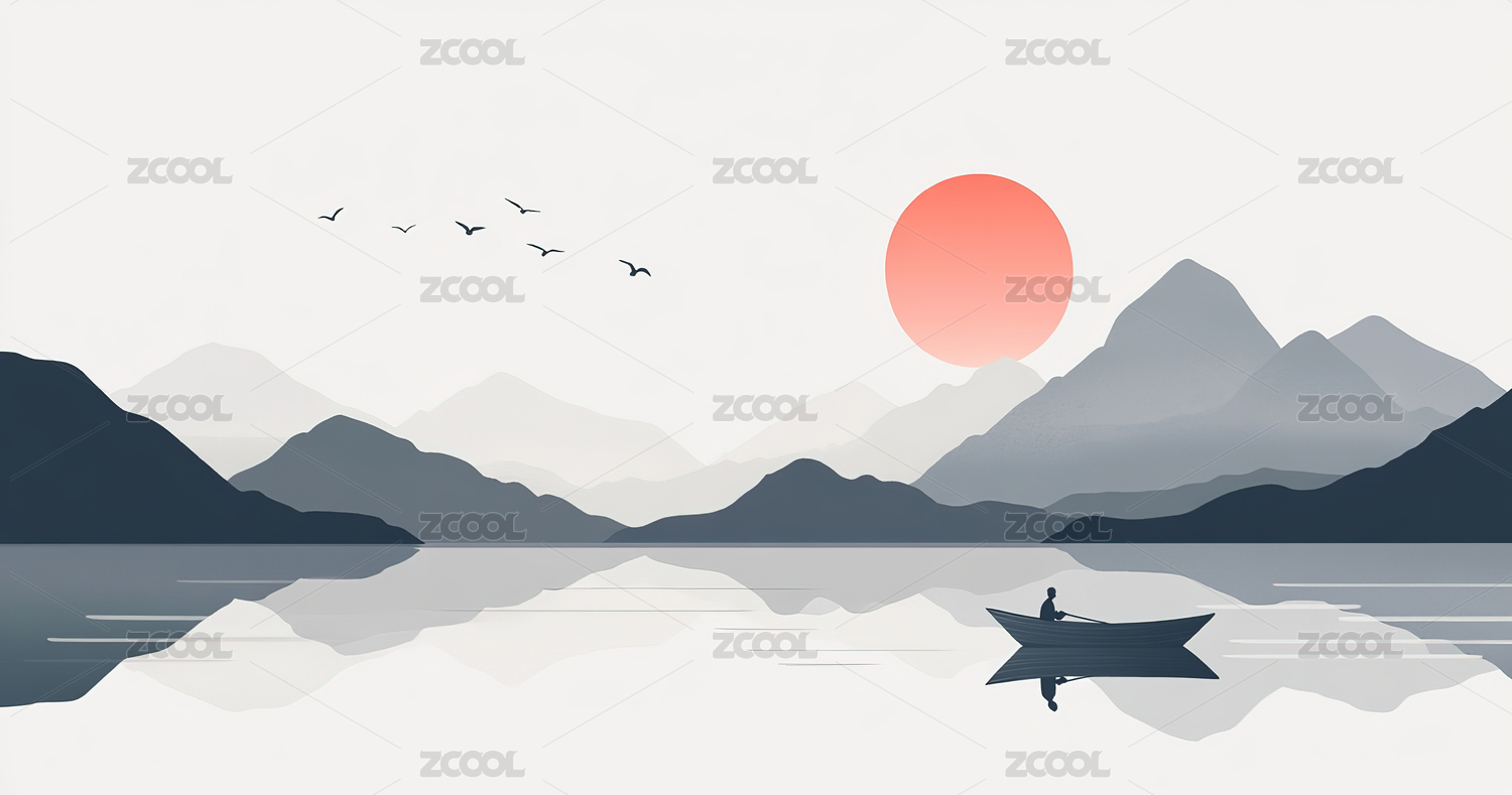 孤舟泛湖,远山淡影,夕阳西下