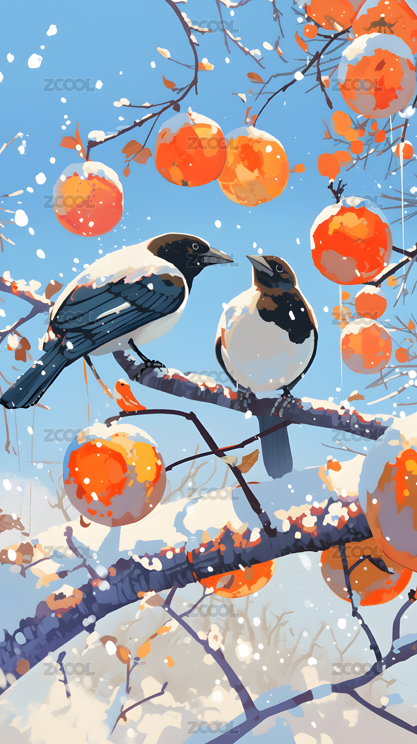 中国风,雪花,雪,冬天,柿子,小鸟,鸟,卡通,插画