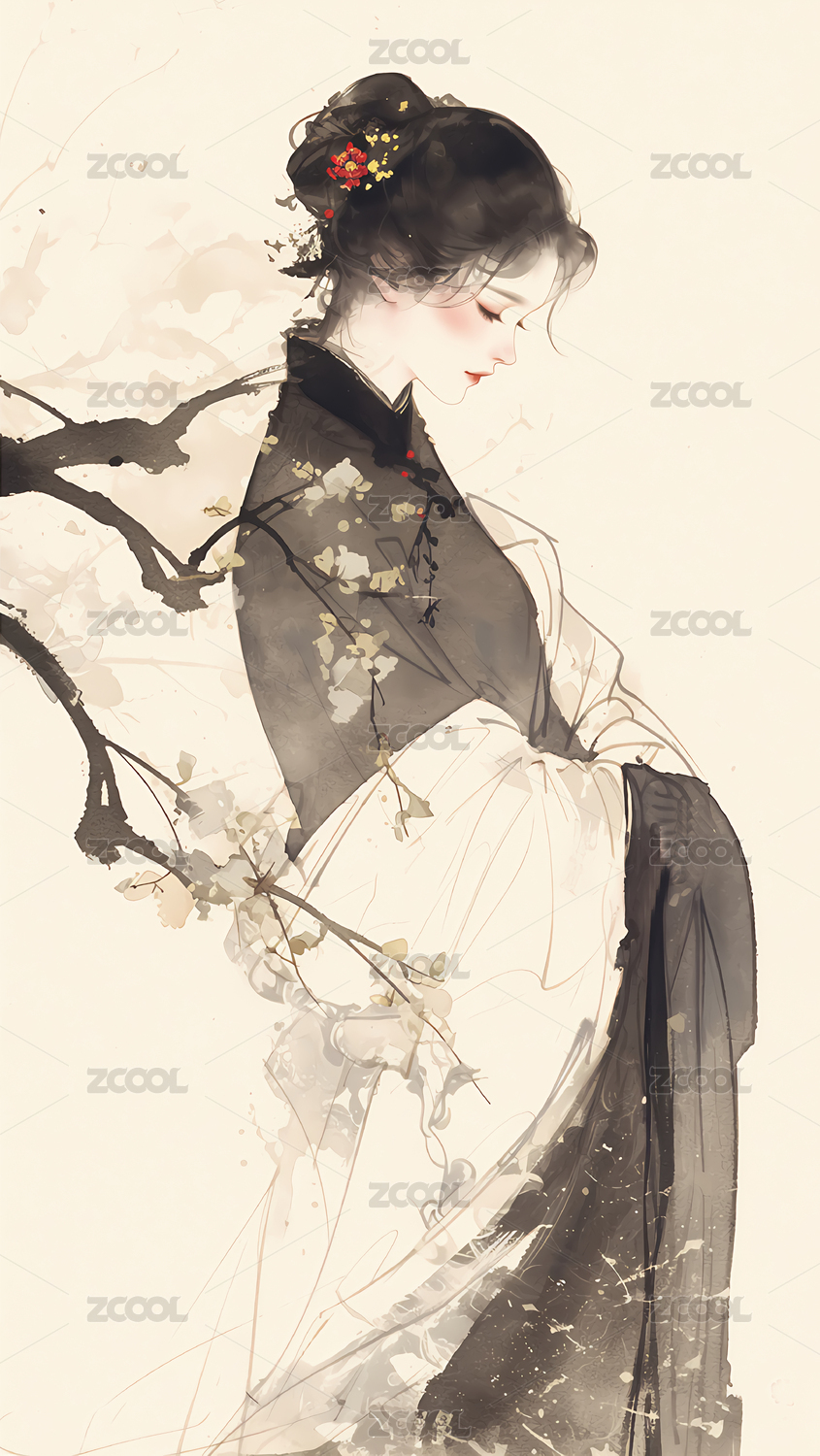 中国风,水墨,牡丹,鲜花,花朵,花,美女,女孩,古代,工笔画