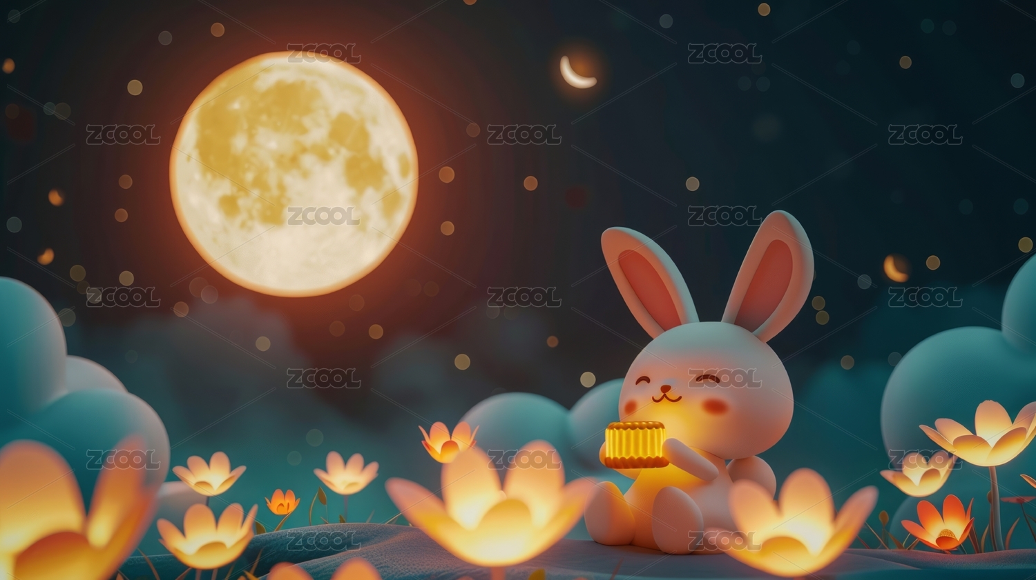 梦幻中秋节夜晚圆圆的月亮兔子抱着月饼
