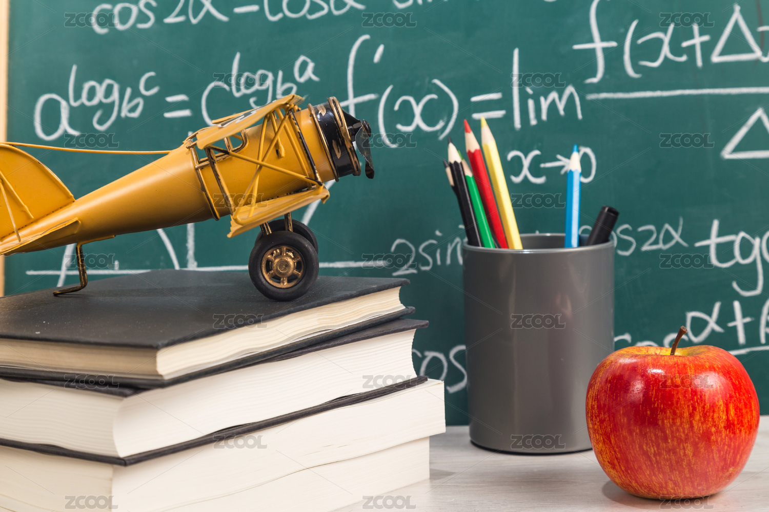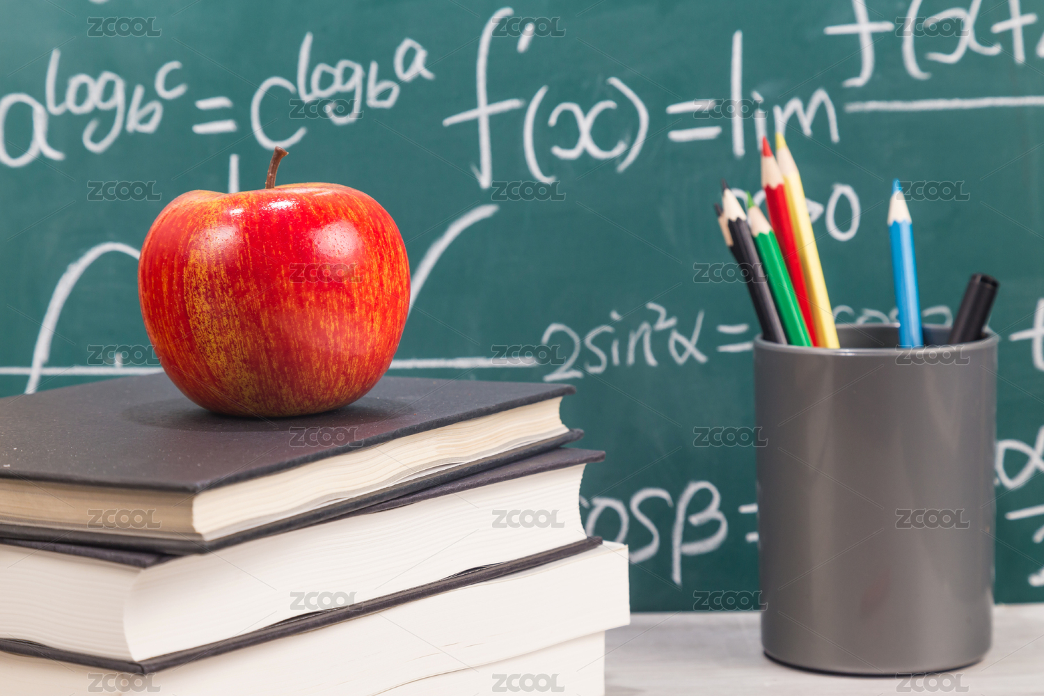 写满数学公式的黑板前一摞书及书上一个红苹果和放大镜和一个装满彩铅笔的笔筒