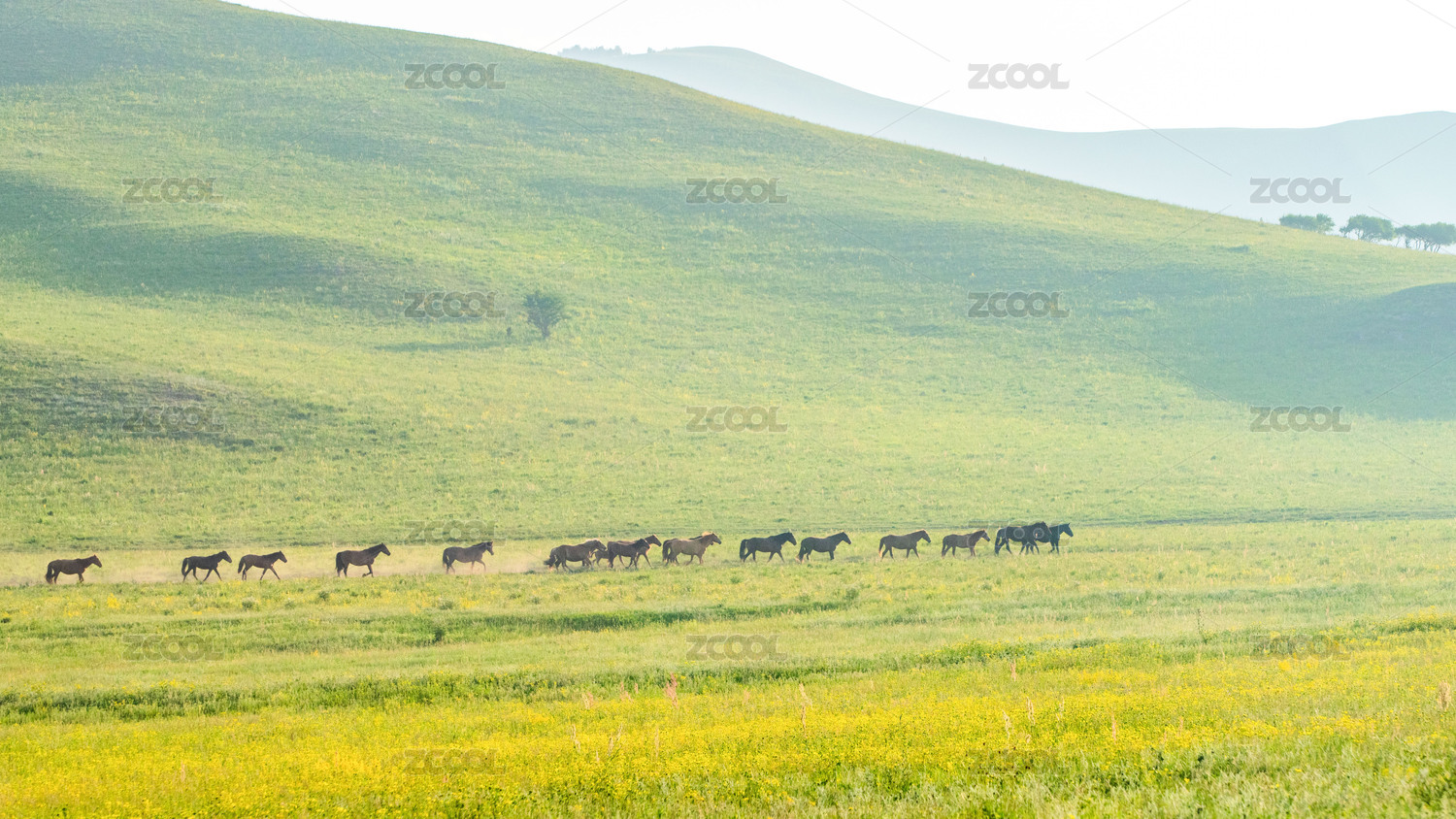 清晨在内蒙古乌兰布统草原牧民赶着马群去放牧