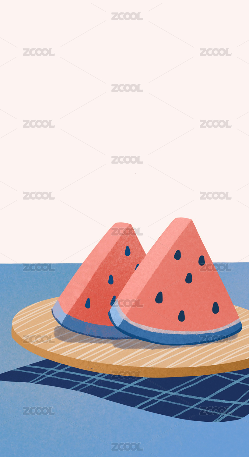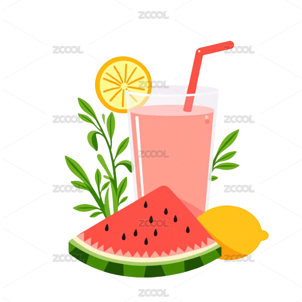 在夏天吃冷饮、西瓜和冰棒的清新插画
