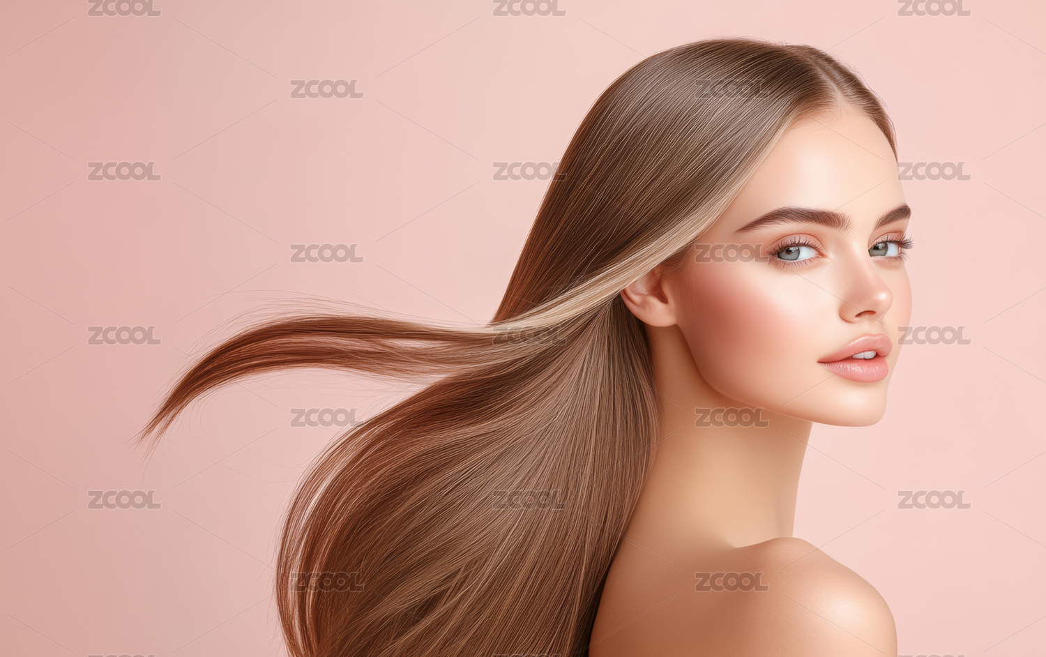 一位棕色长发美女在粉色背景下的侧颜肖像