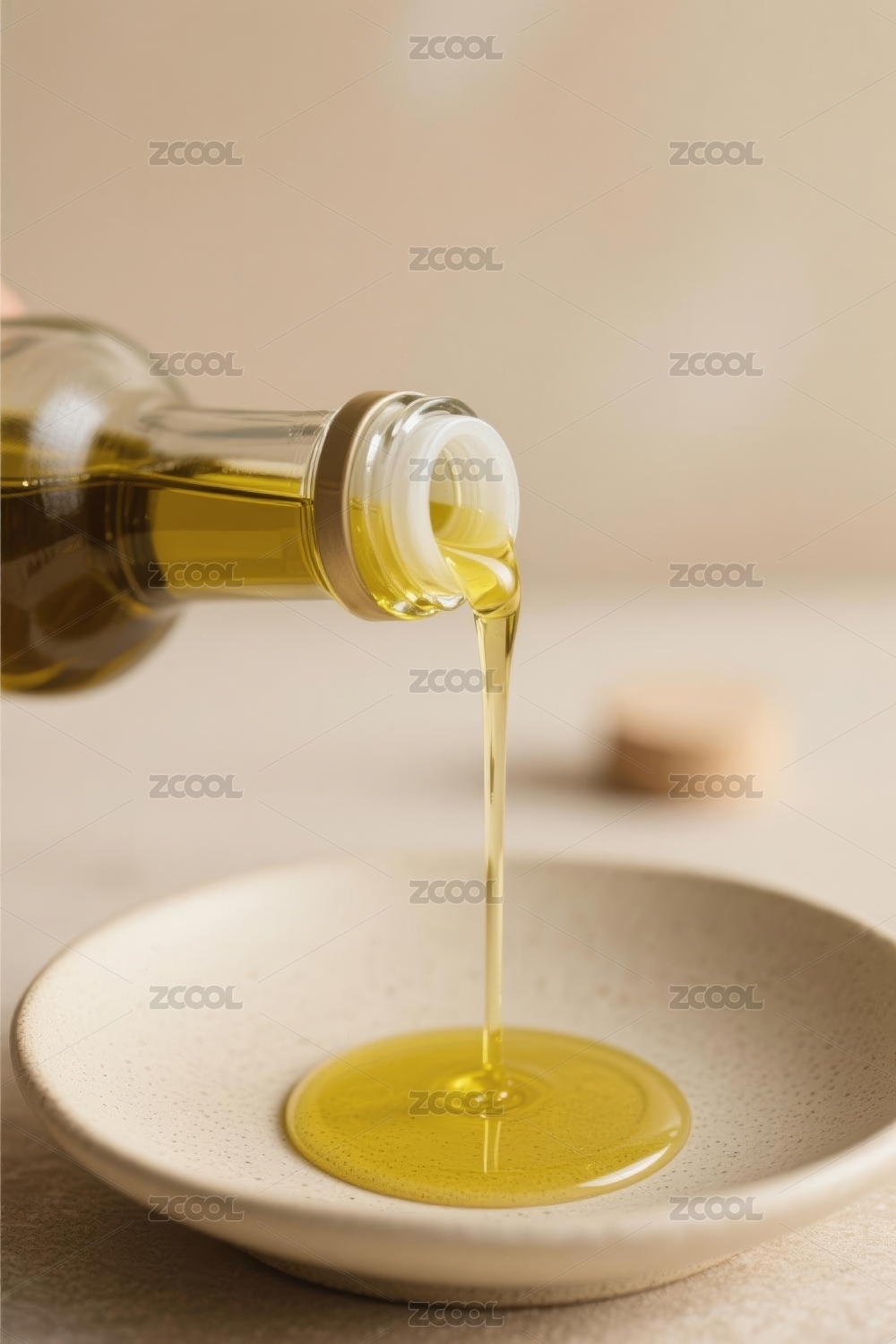瓶中的橄榄油倒入一个玻璃碗中,健康饮食