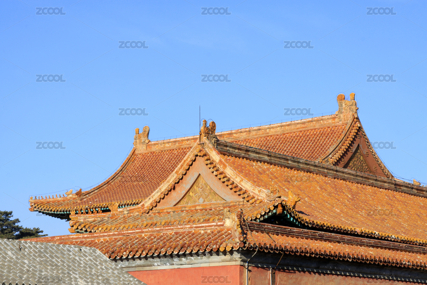 中国北京故宫博物院古建一角——琉璃瓦屋顶、瑞兽