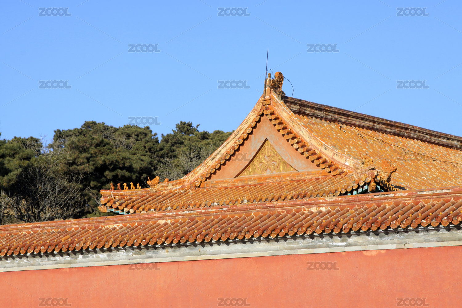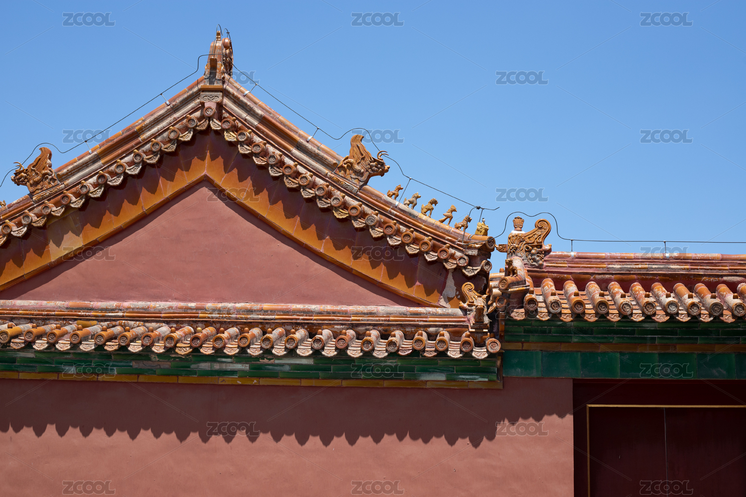 中国北京故宫博物院古建一角——红墙琉璃瓦屋顶、瑞兽