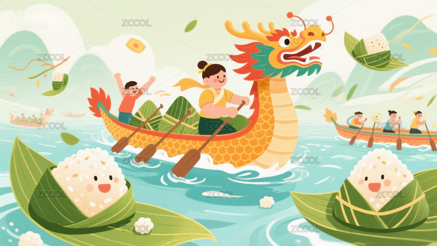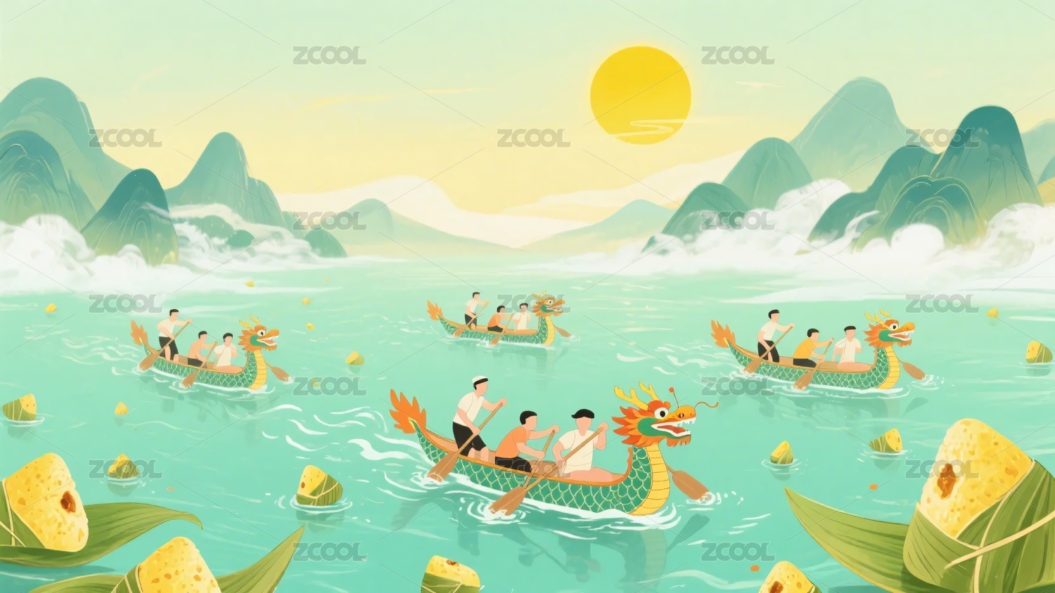 插画,端午,节日,绿色,龙舟,粽子,蓝色,HECDBF2021,HEDBF2022