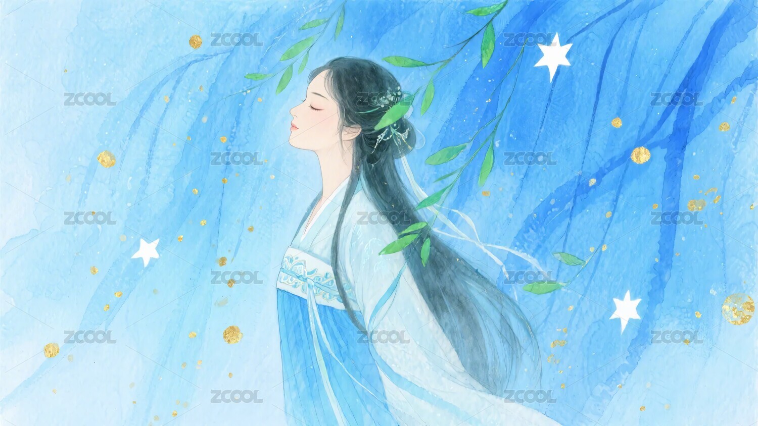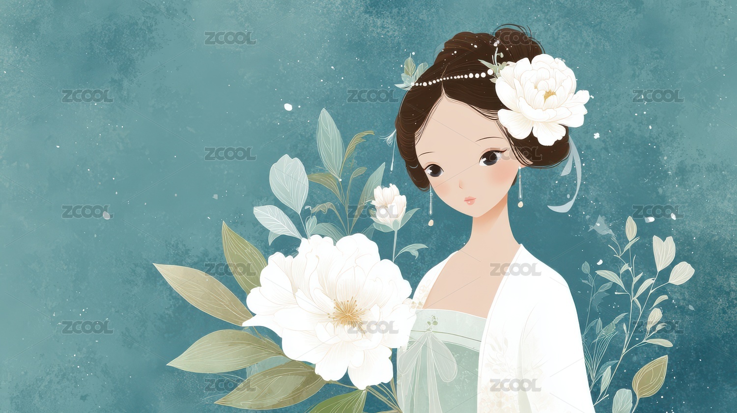 素色白衣头戴金钗古风美女搭配蓝色背景插画