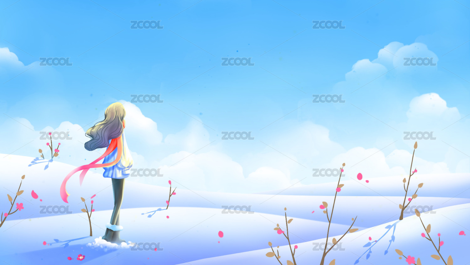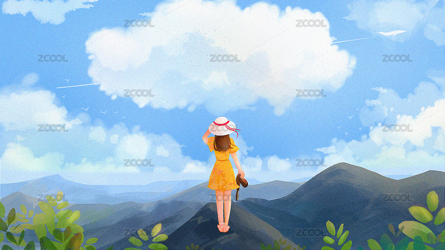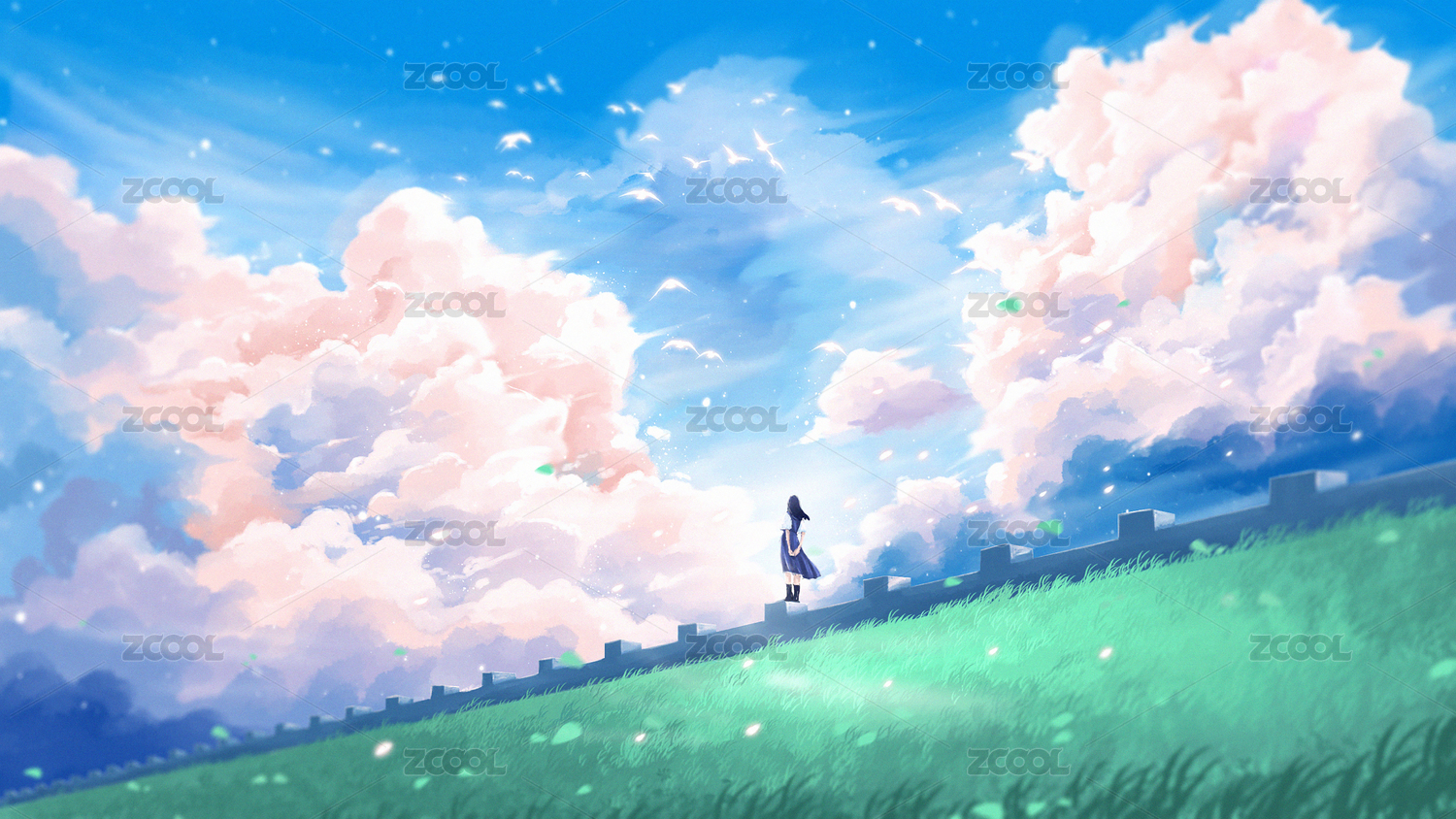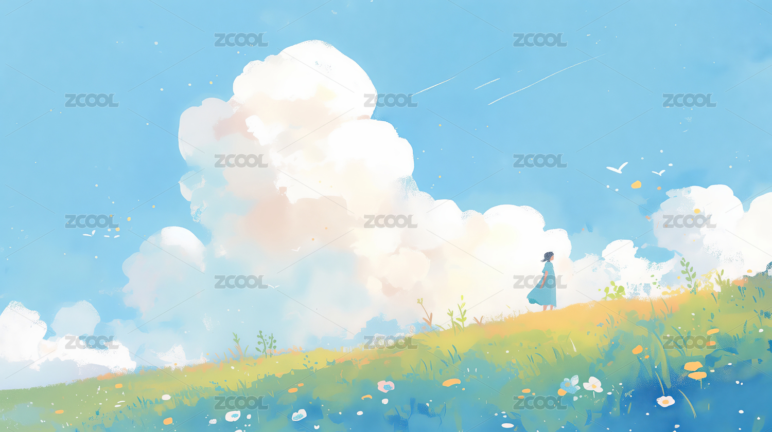 女孩在蓝天白云中飞翔,唯美动漫风通用插画
