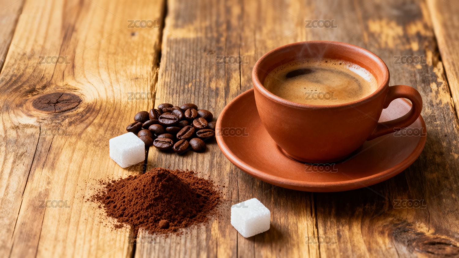 一杯咖啡和咖啡豆摆放在桌面上特写