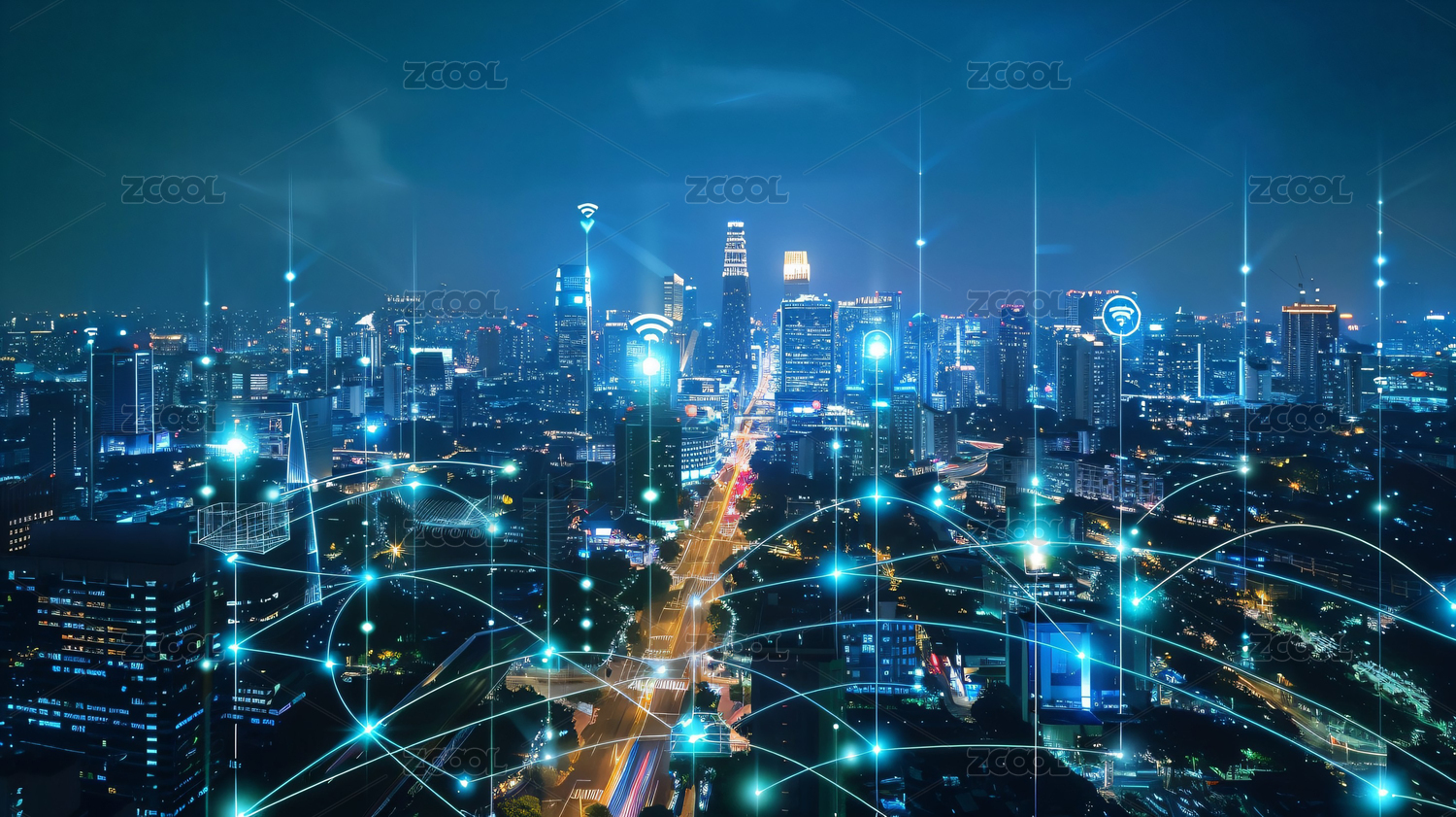 上海黄浦江边上浦东现代建筑和互联互通智能通讯概念