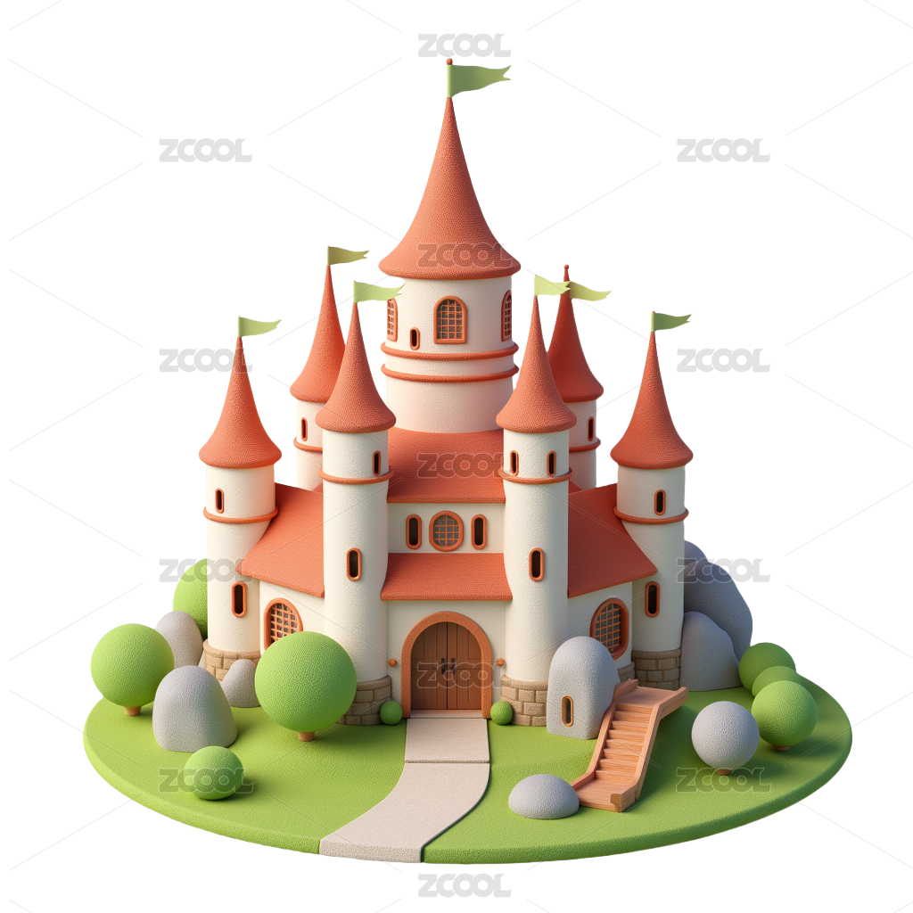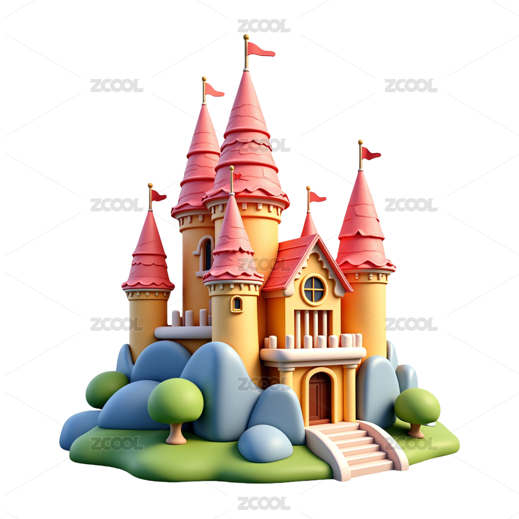 3D城堡地标建筑儿童梦幻堡垒卡通房子插画