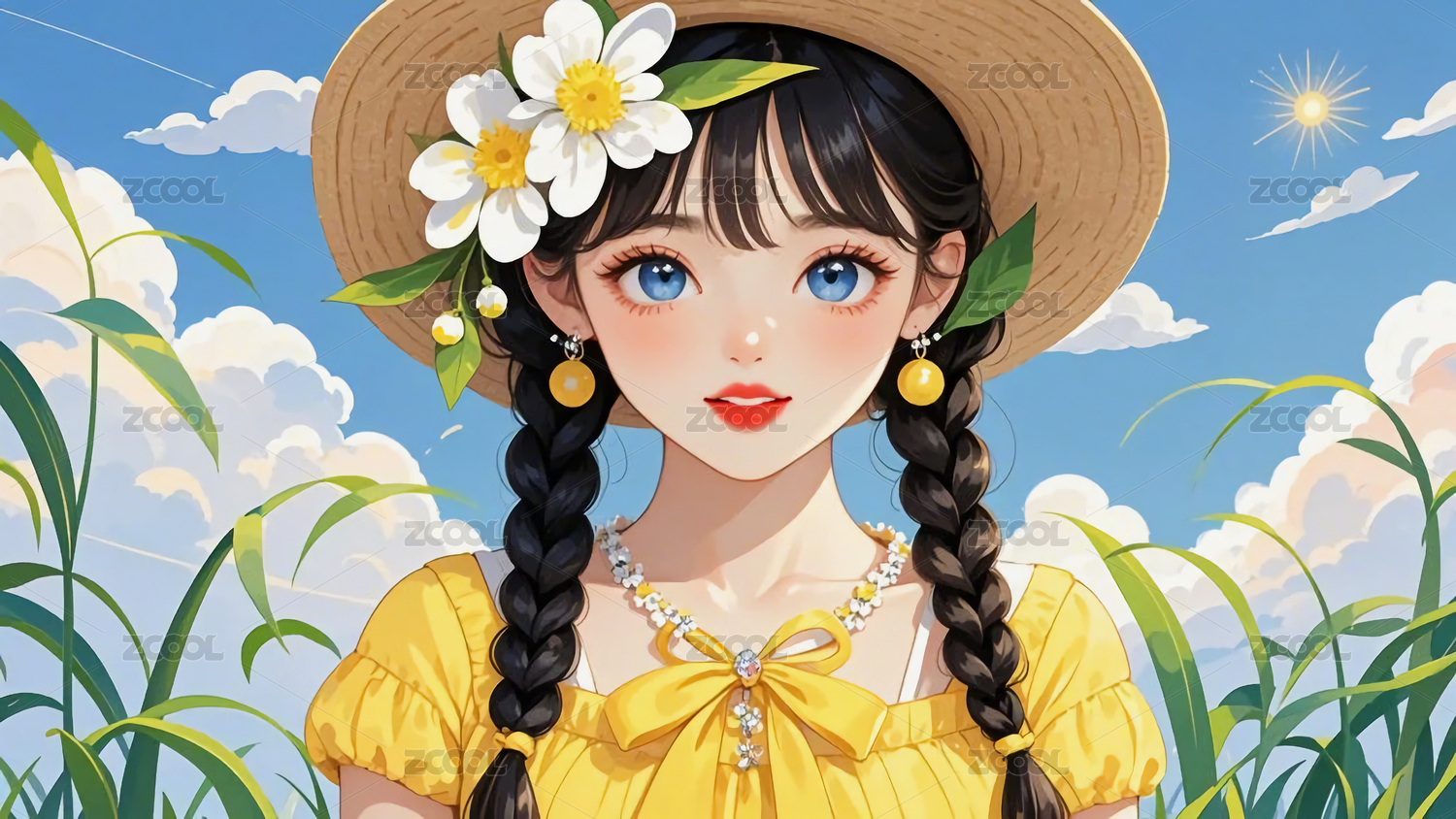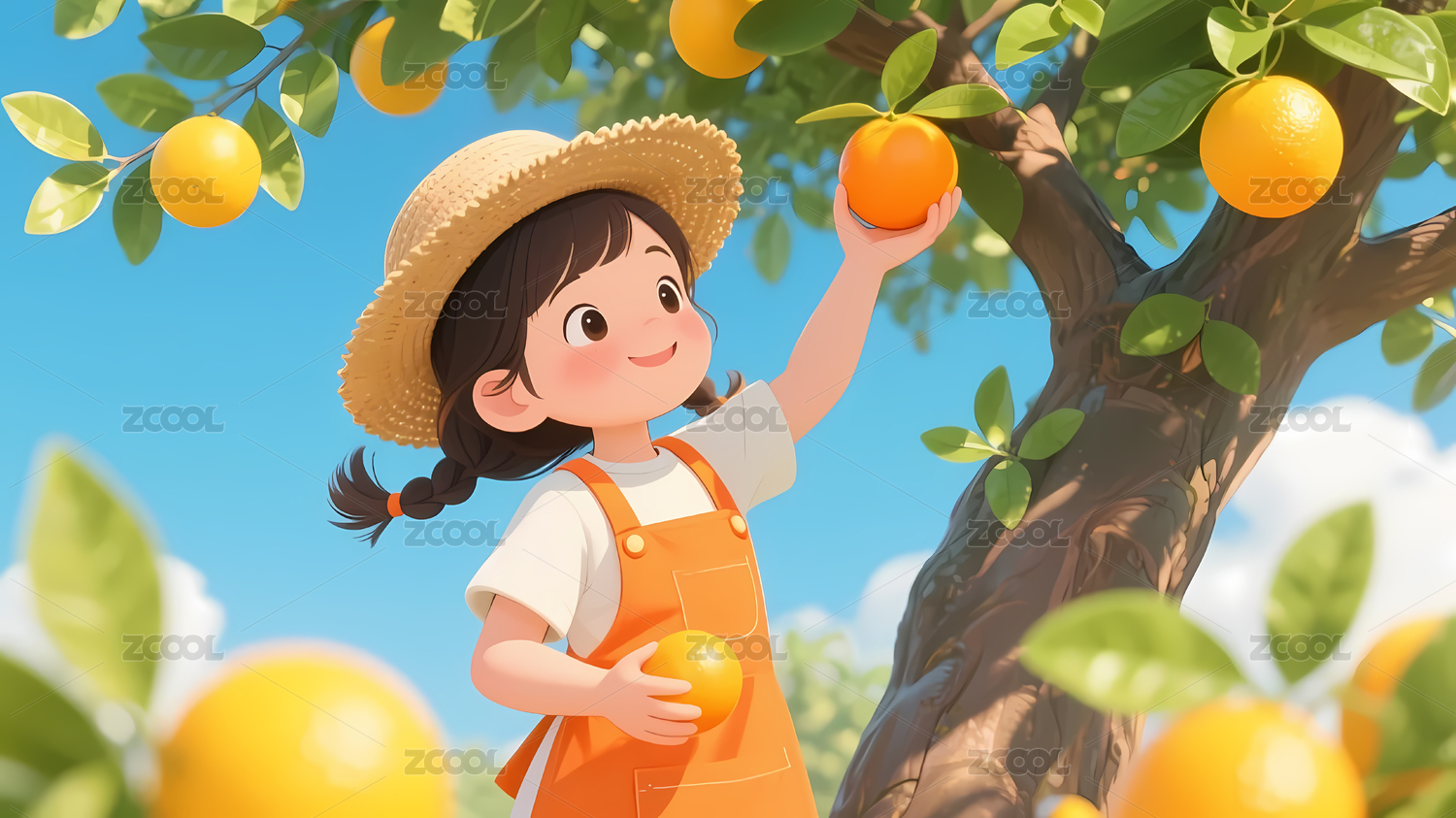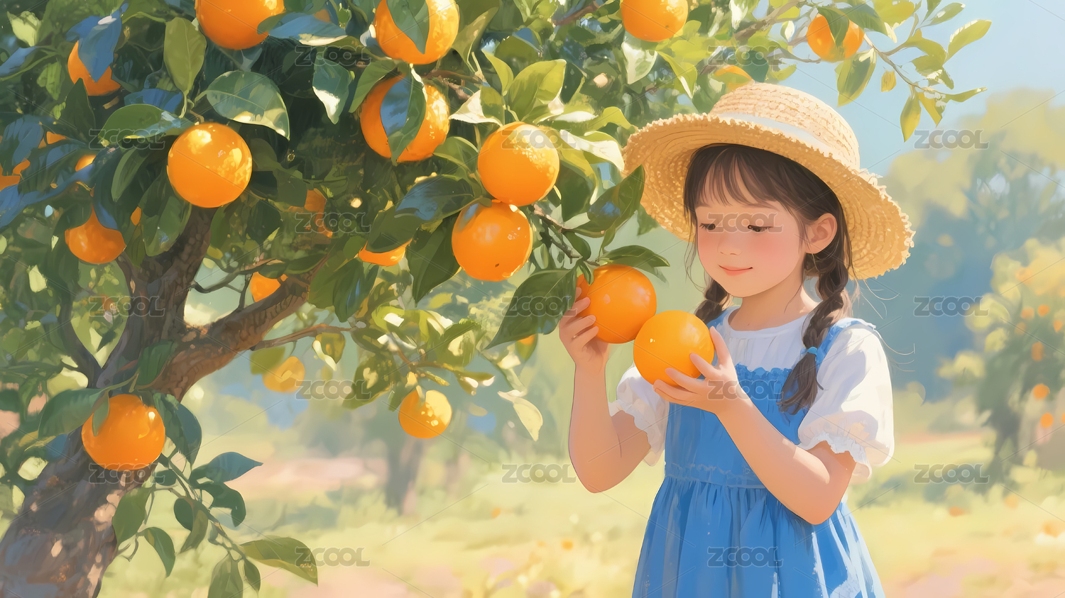 秋季明亮戴草帽手捧苹果的女孩插画绘画