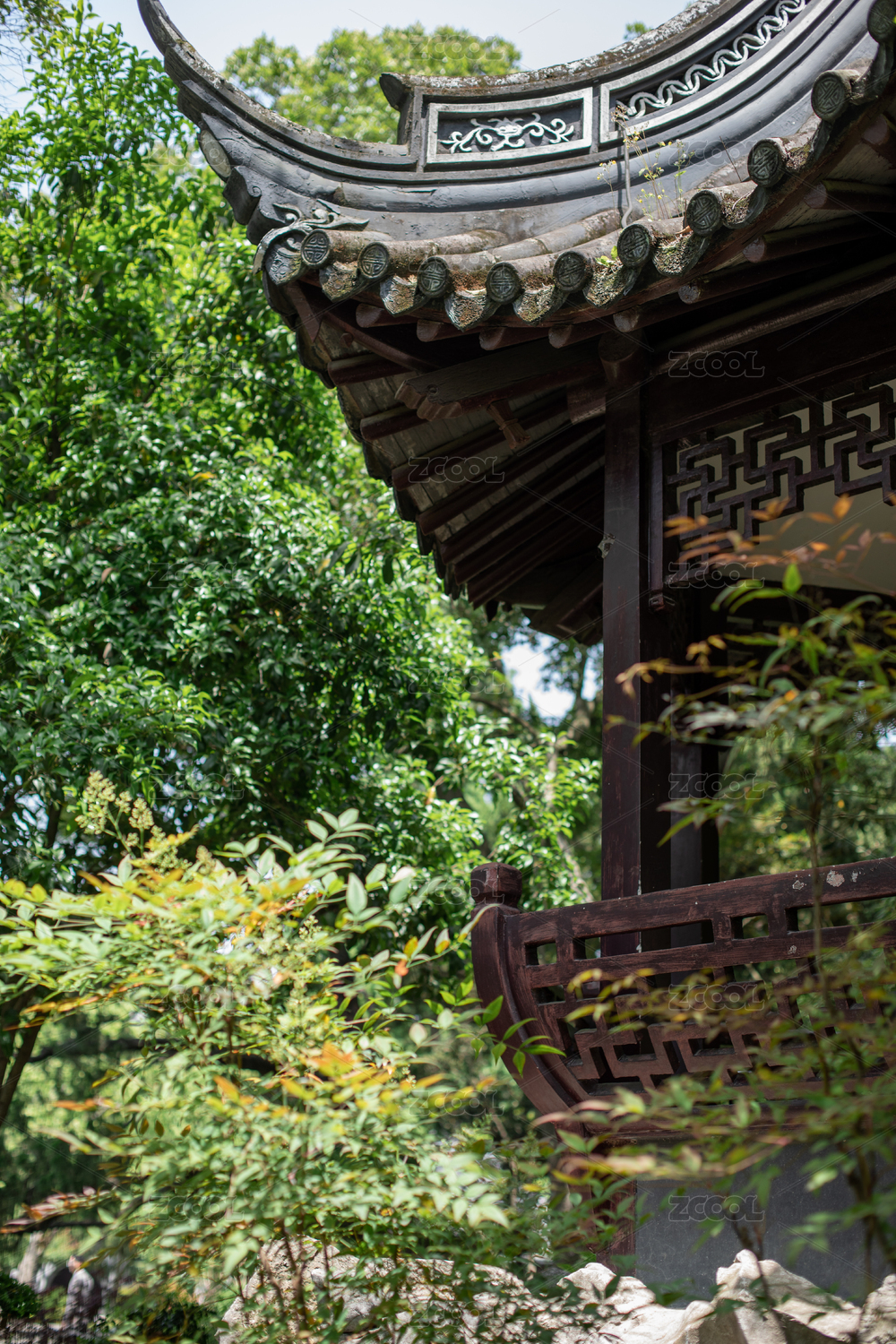 中国苏州园林清幽的自然风光,古建筑与绿树