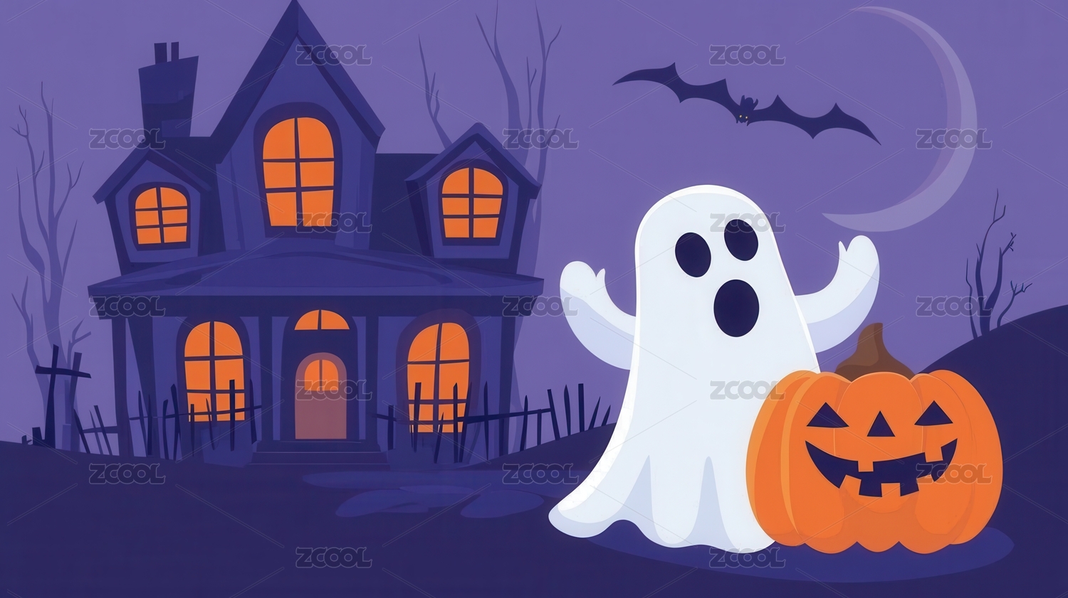 欢乐万圣节幽灵南瓜灯鬼怪城堡节日插画