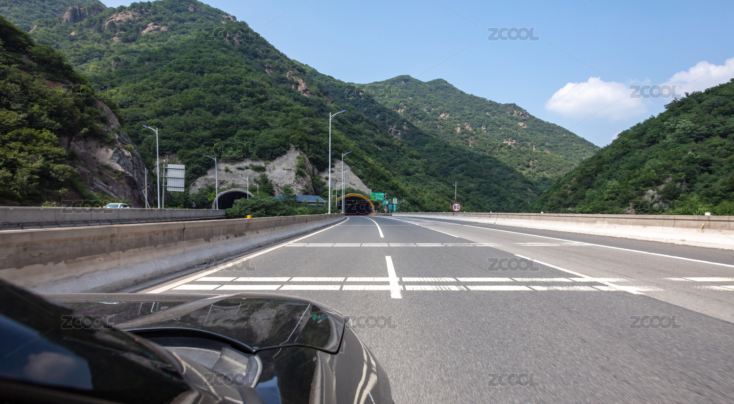 晴好天气下一辆白色小汽车行驶在古田近郊一条新建的铺着柏油路面的快速通道,中国福建上杭古田