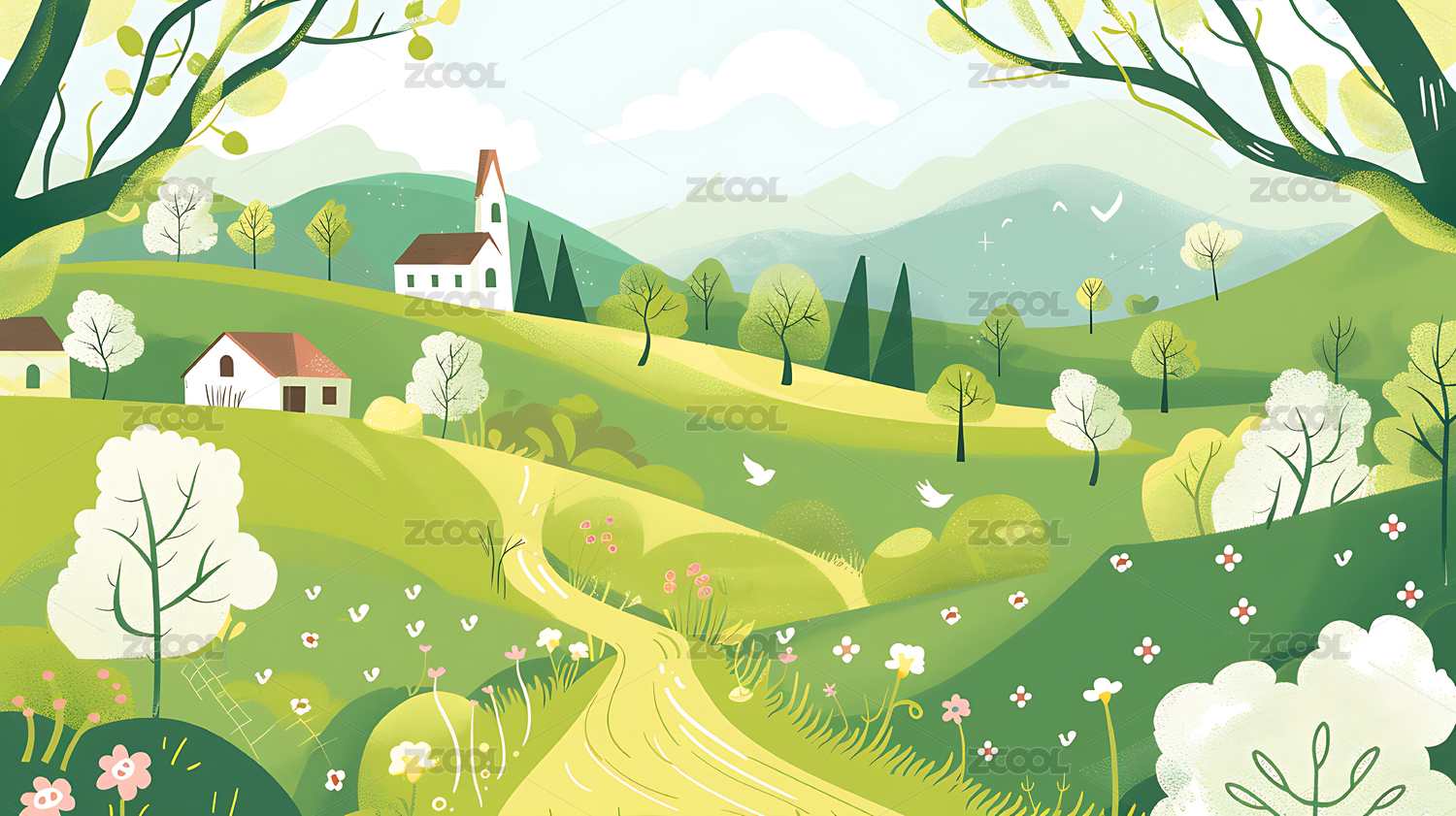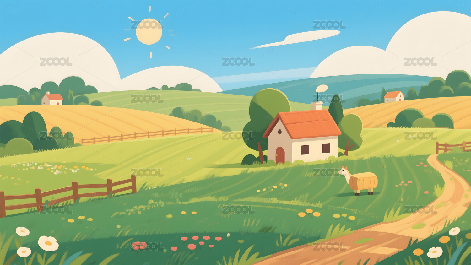 插画,房子,树木,草地,天空,云朵,野花,山坡,艺术,壁纸