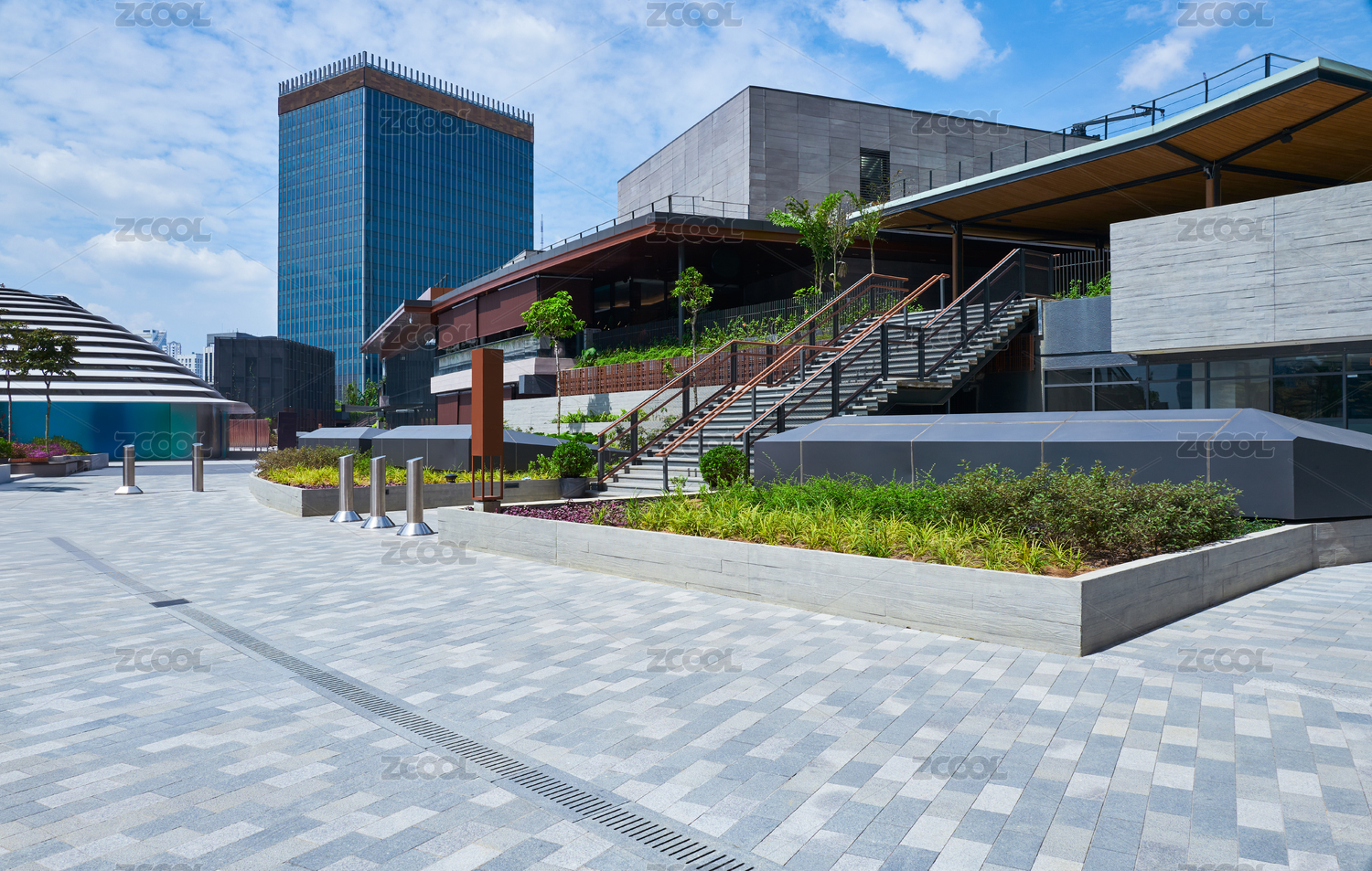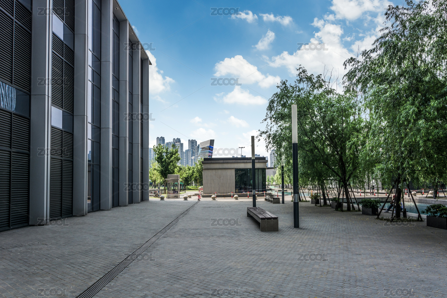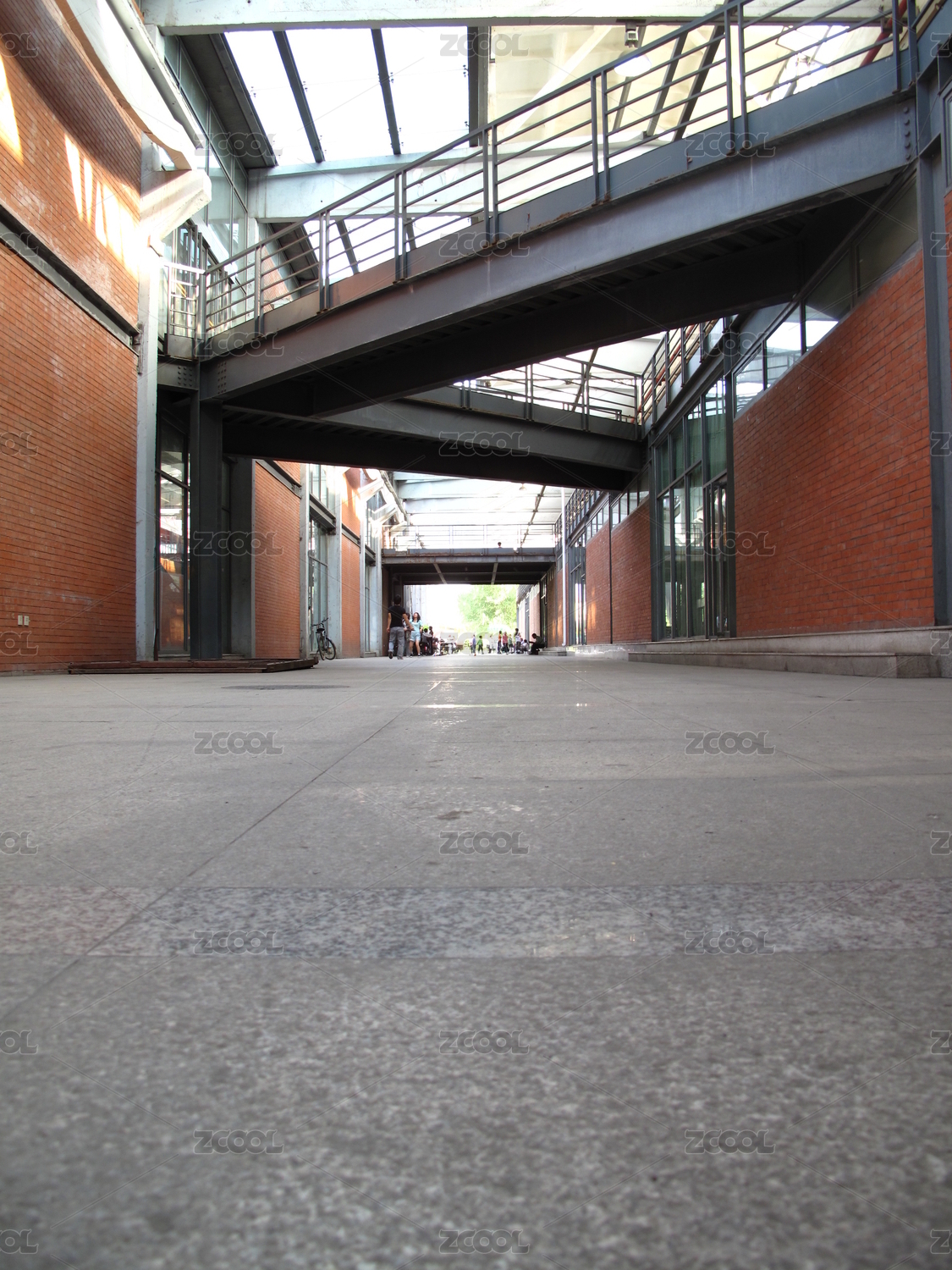 秋天早上的北京798艺术区广场工厂钢铁架桥旁的建筑和绿树