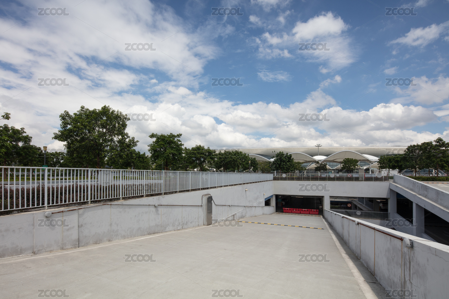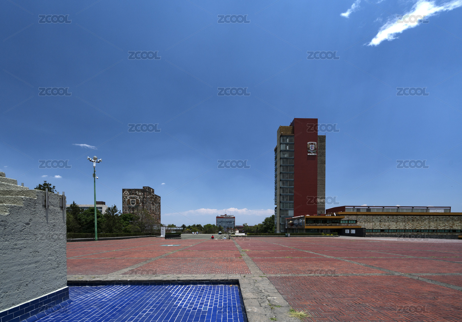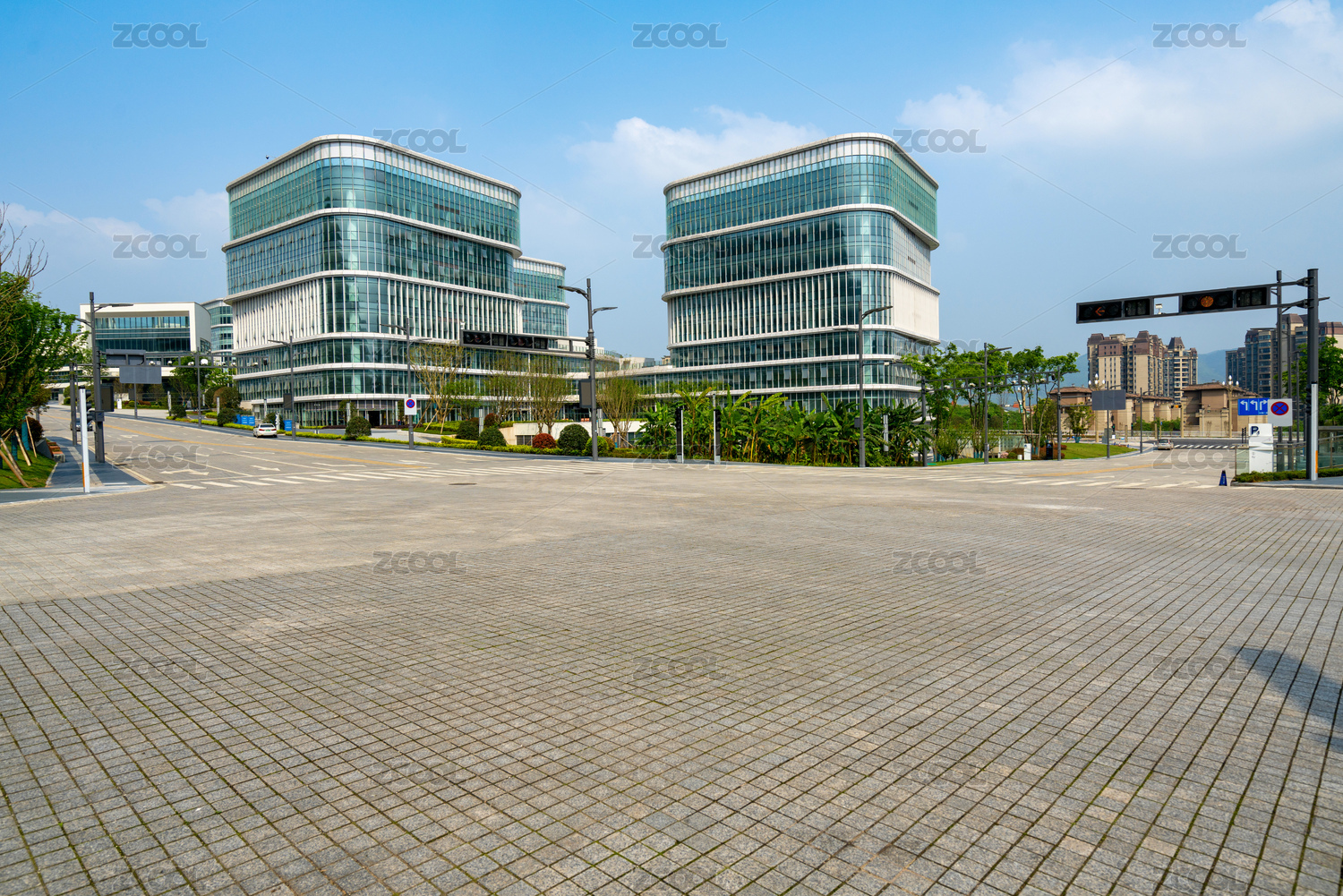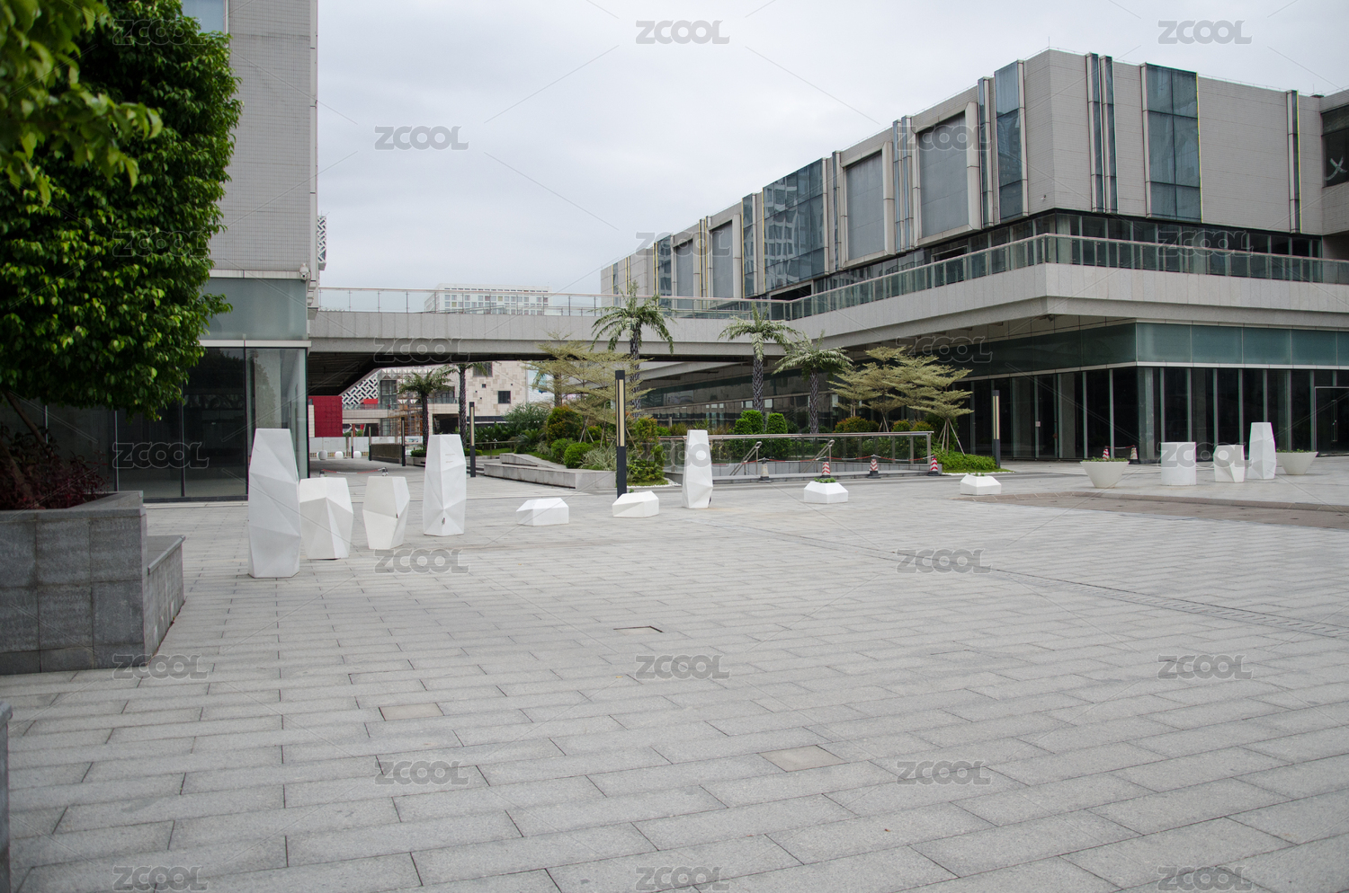 秋天早上的北京798艺术区广场工厂钢铁架桥旁的建筑和绿树