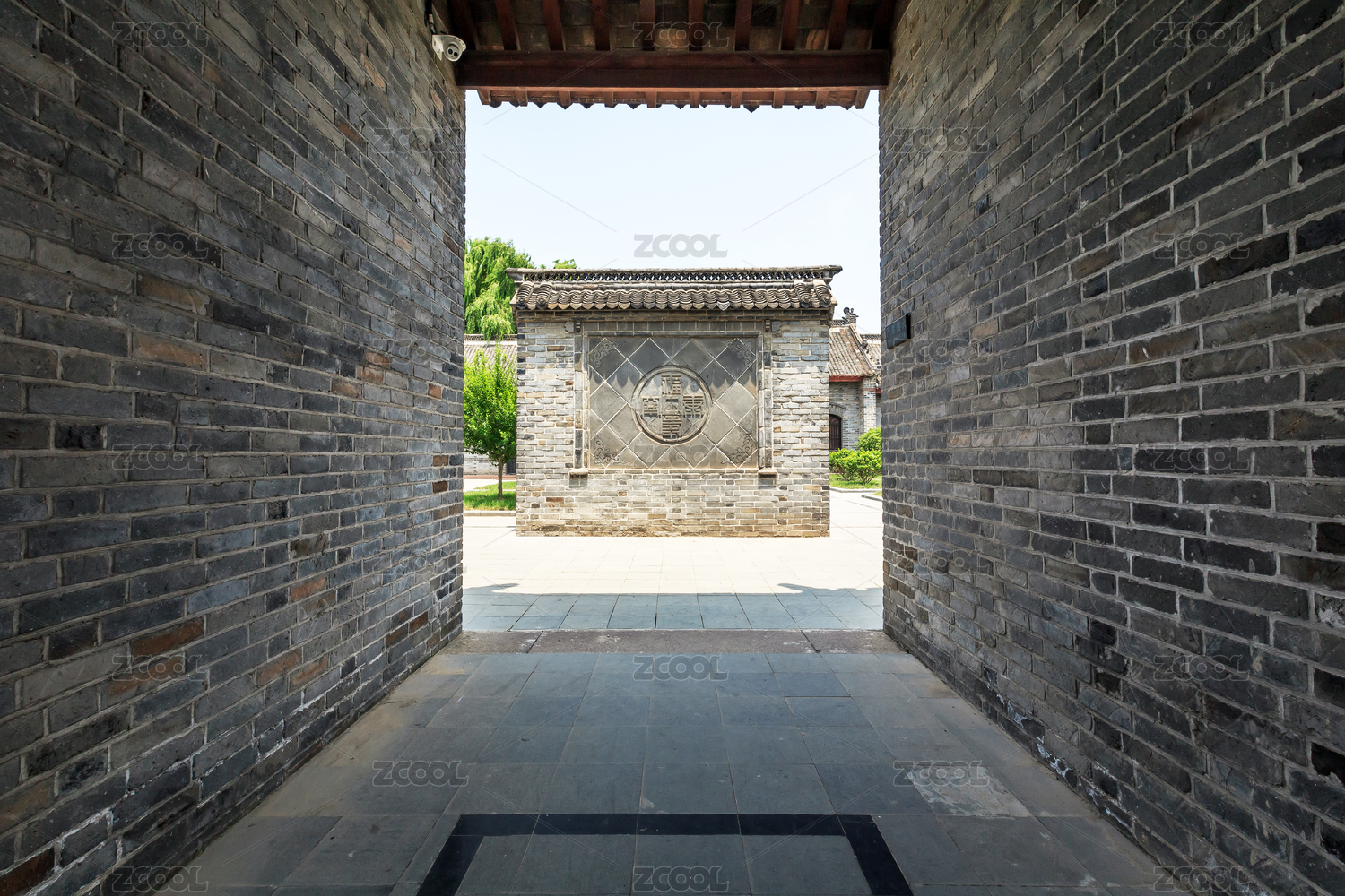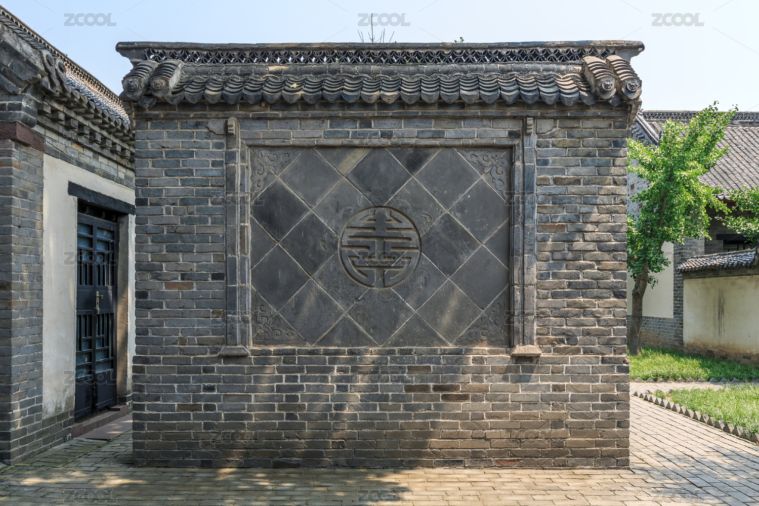 中国山东省鲁南风格民居院落内的灰砖砖雕影壁墙