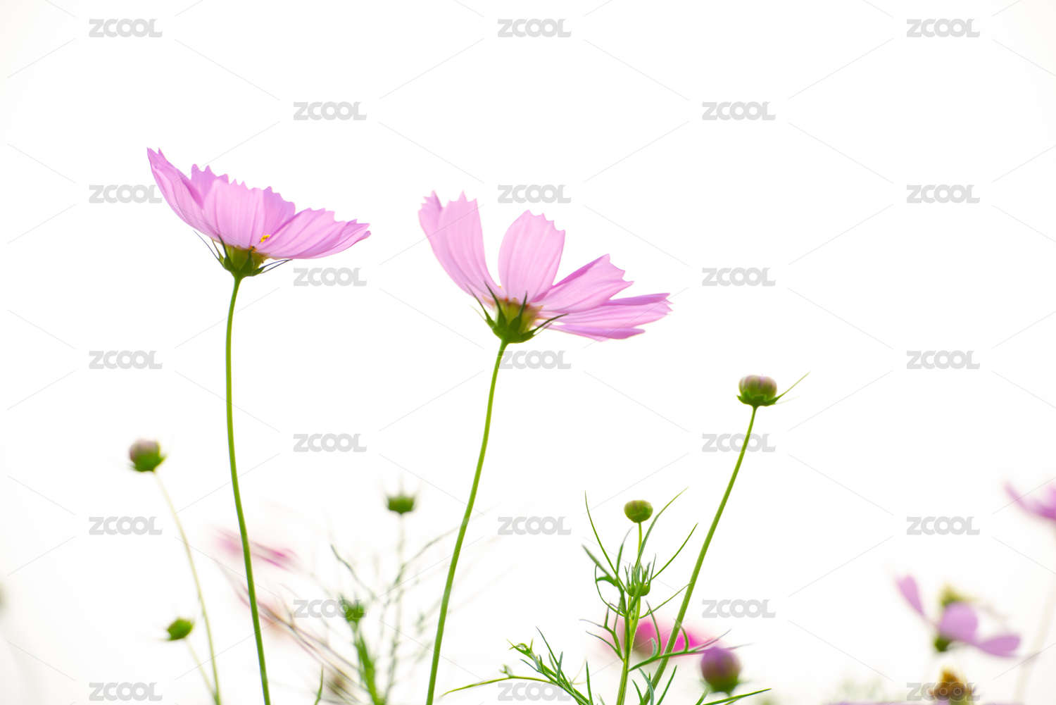 竖幅仰拍的以白色天空为背景粉色波斯菊特写