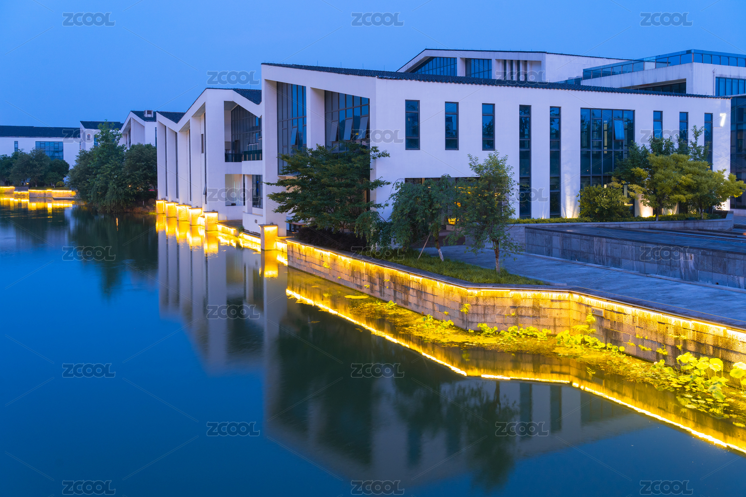 浙江杭州湘湖金融镇风情特色小镇建筑夜风光
