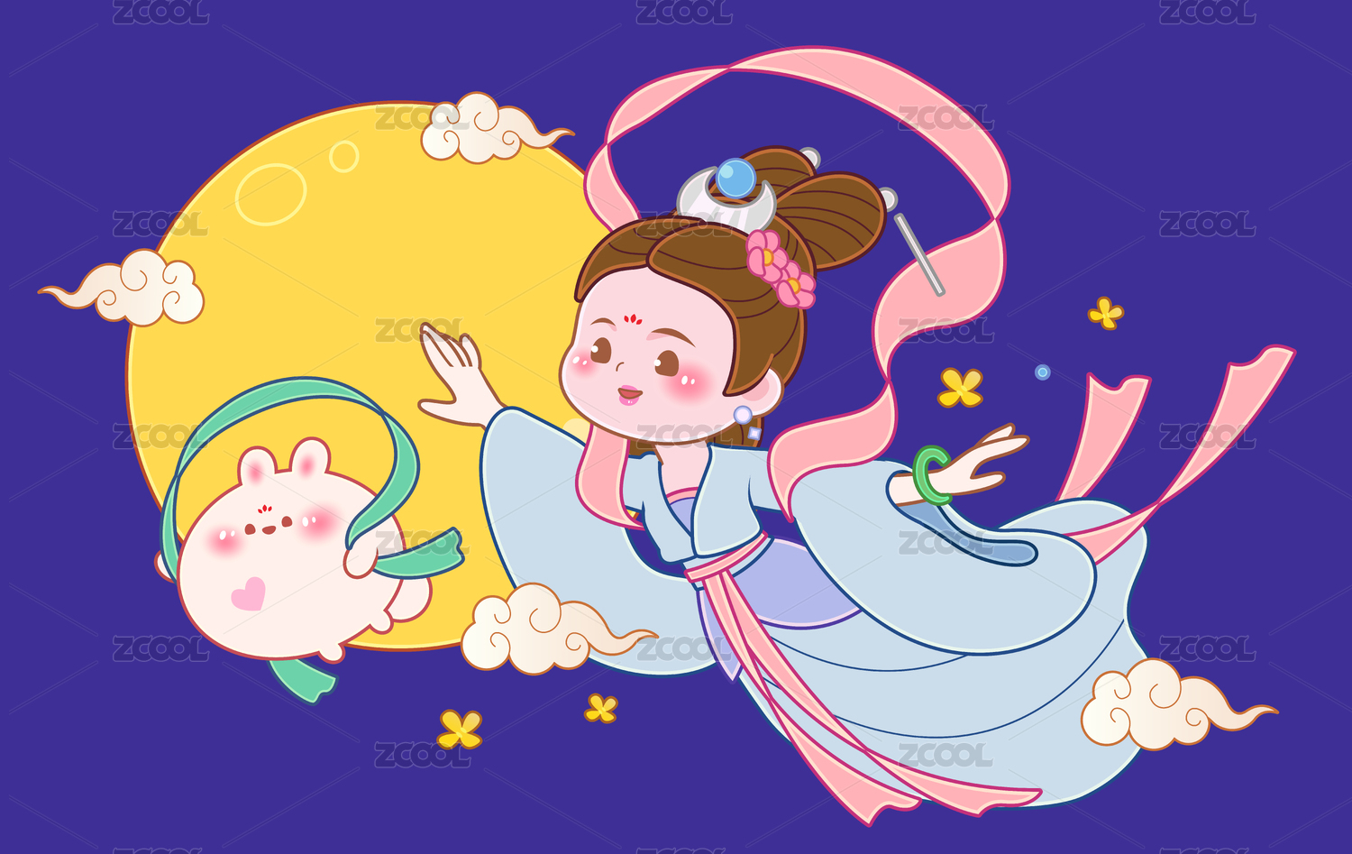 卡通可爱中秋月亮嫦娥玉兔节日插画