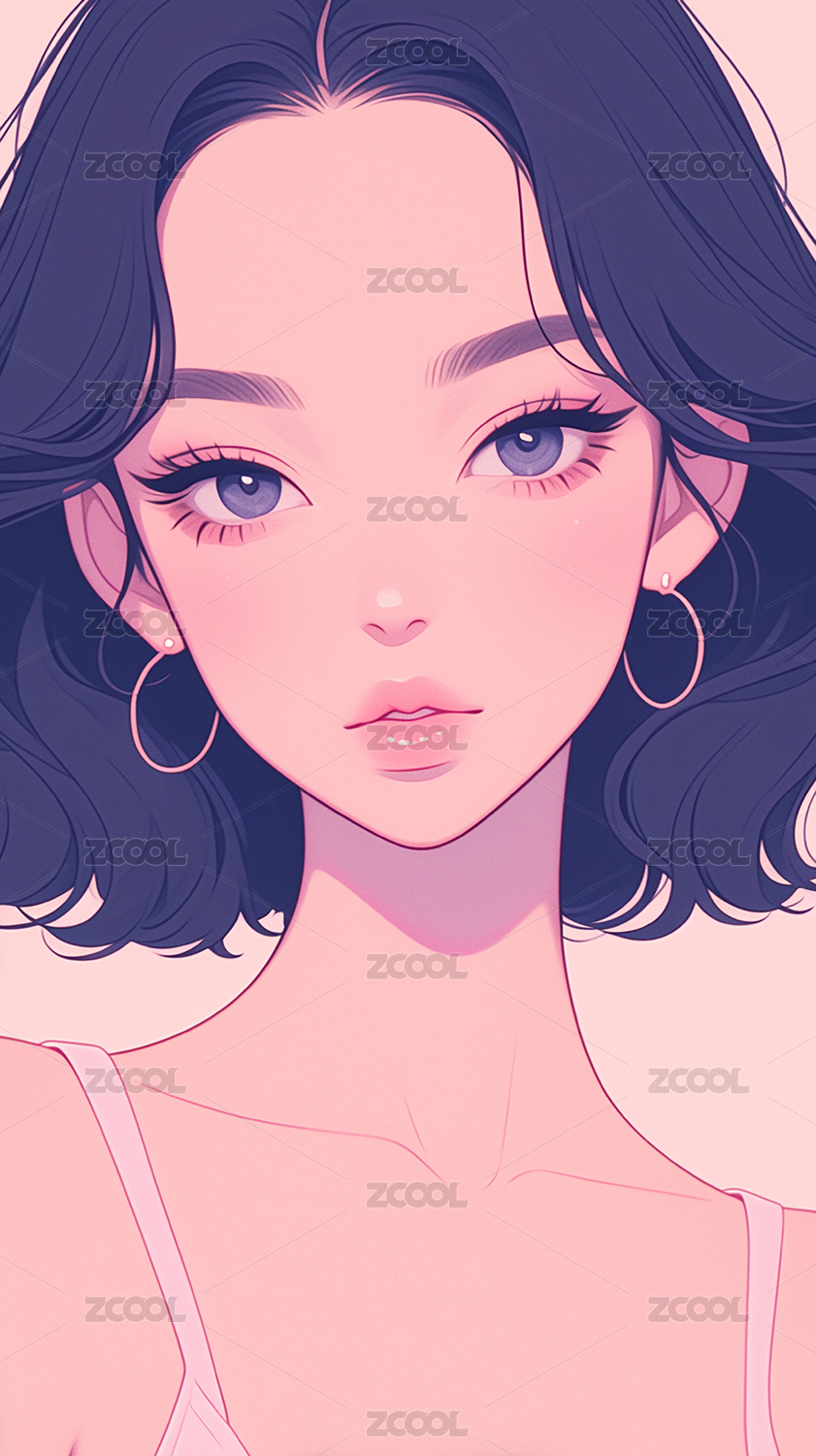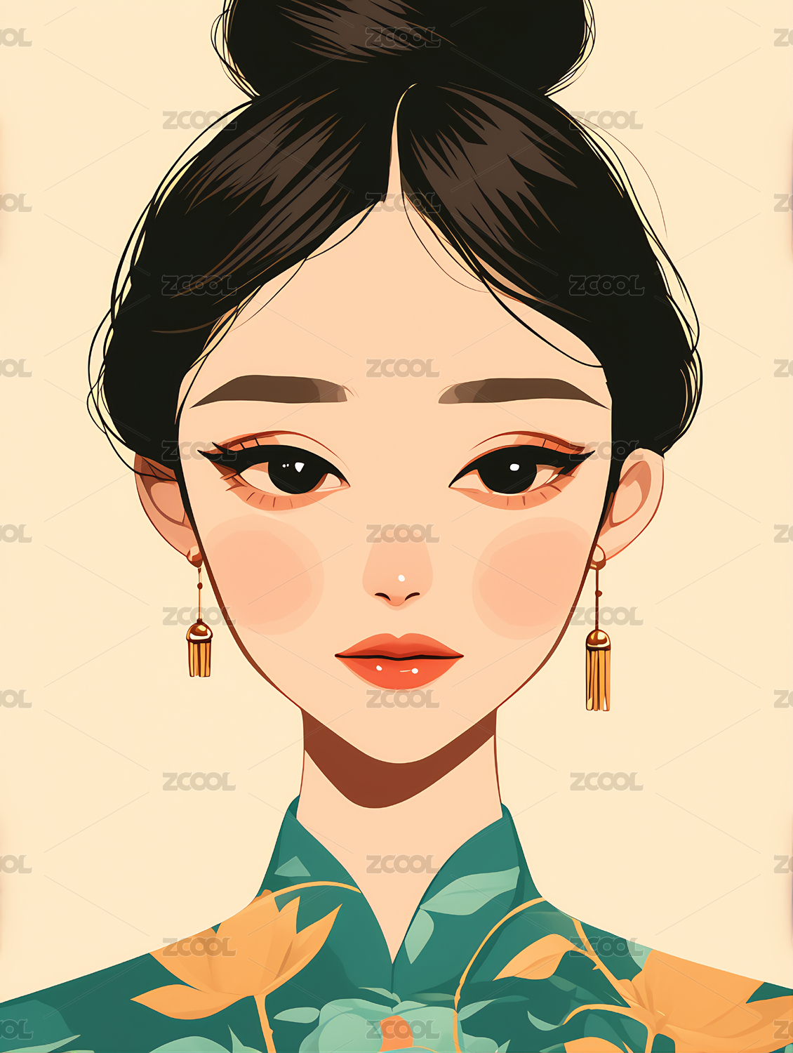 夏天黑头发黄皮肤东方女性头像扁平插画绘画