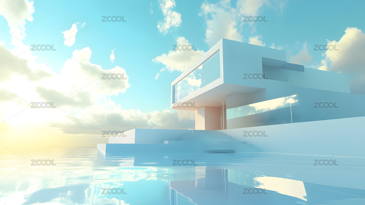 房子淡蓝色瓷砖台阶走廊天空云朵3D插画