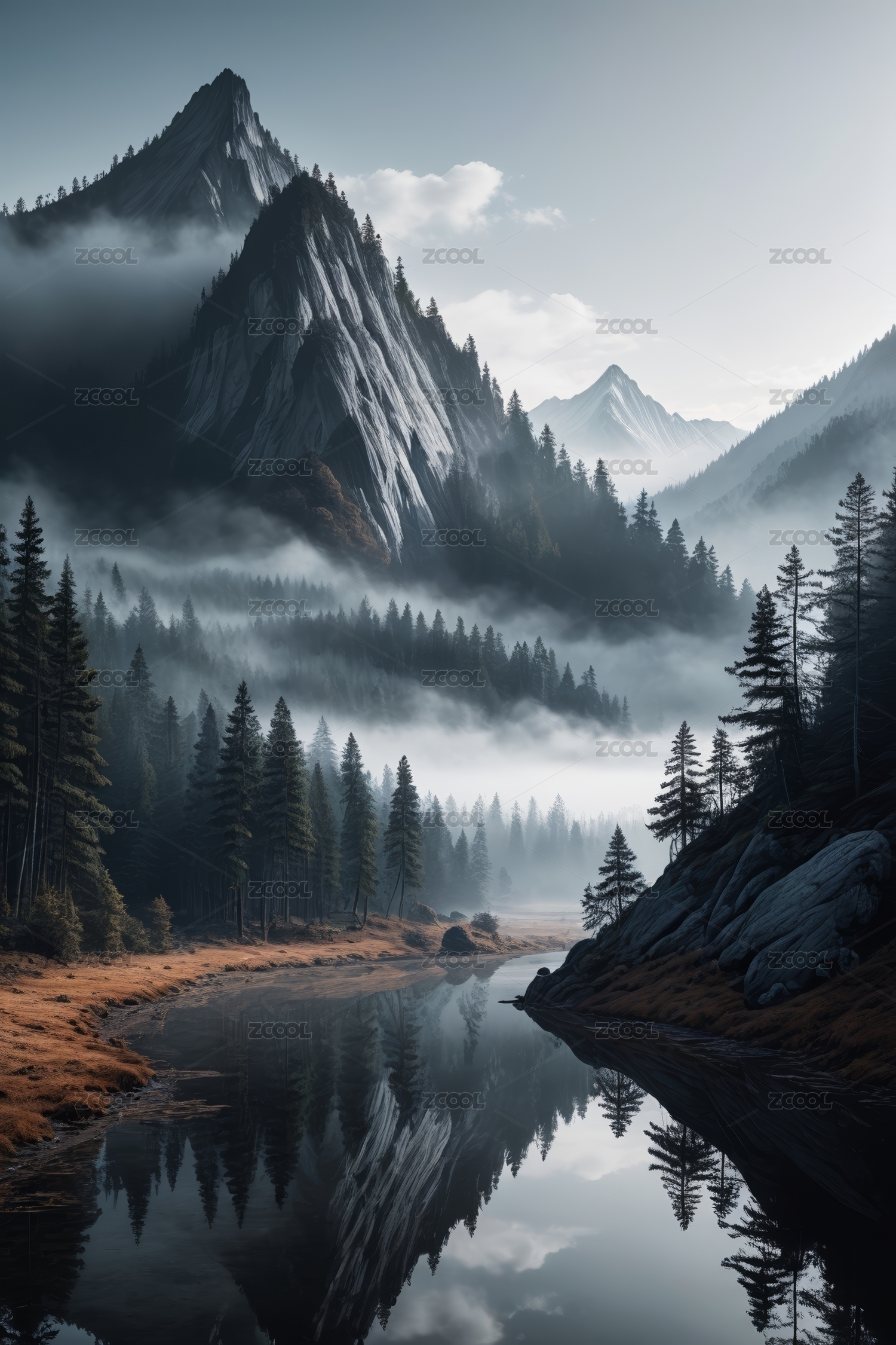 山水间的宁静倒影 雾锁山林的诗意画卷