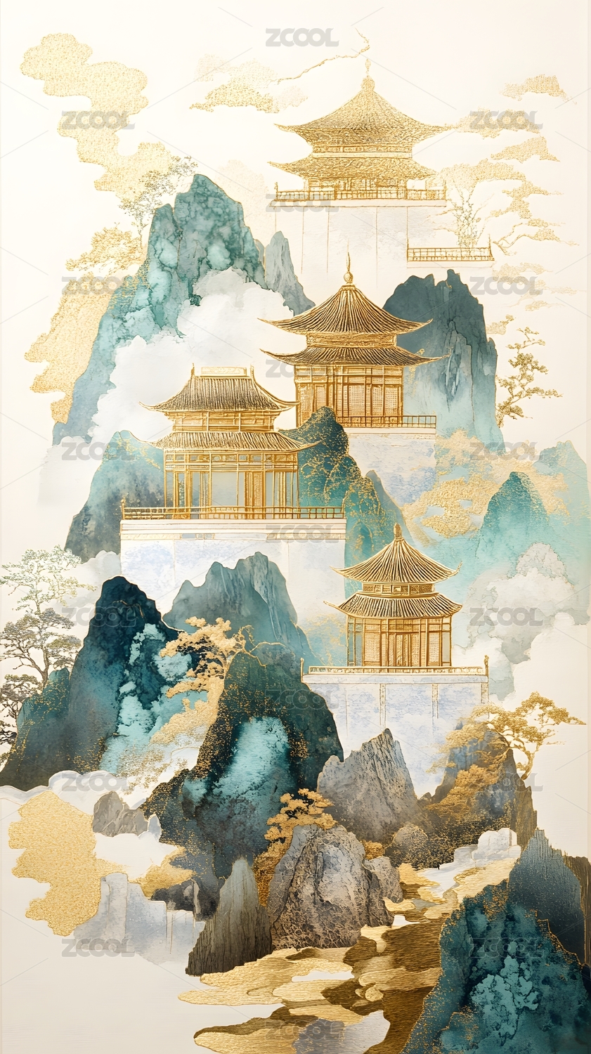 水墨画, 山峦, 宫殿, 金色, 祥云, 青绿, 山水画, 中国风, AI, 数字艺术