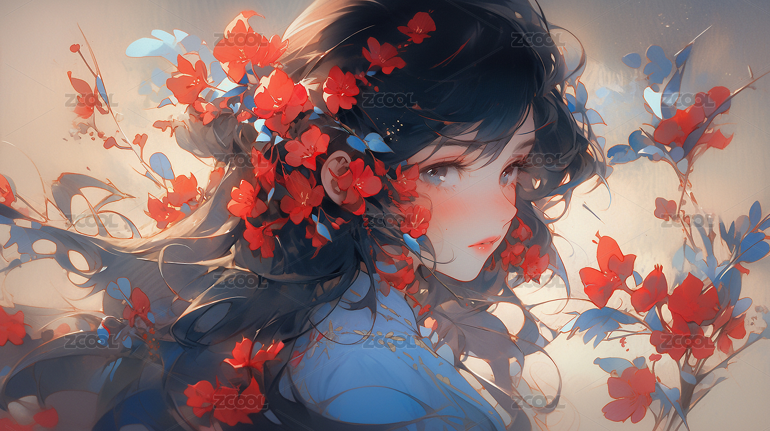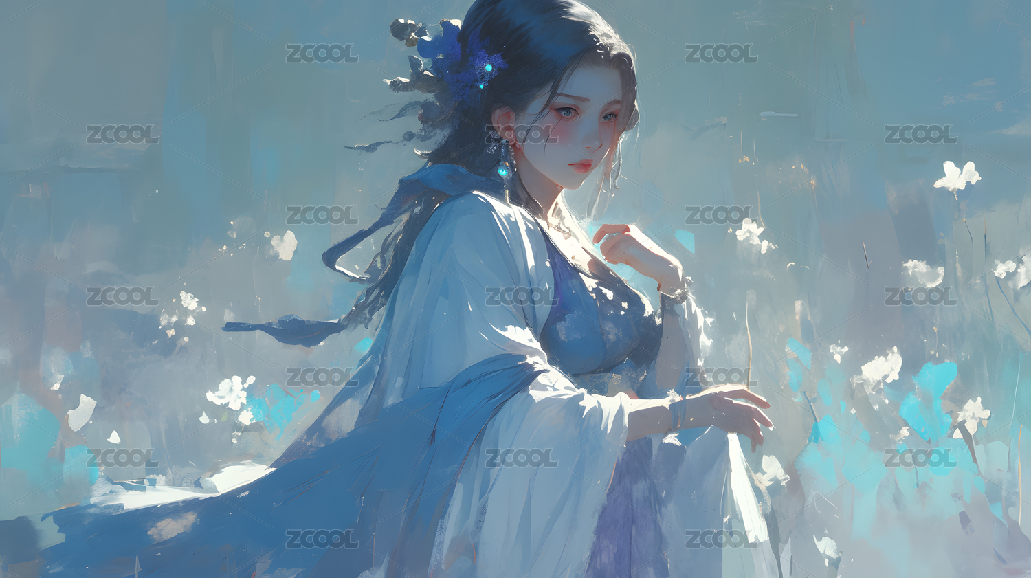 蓝衣少女花海梦幻氛围