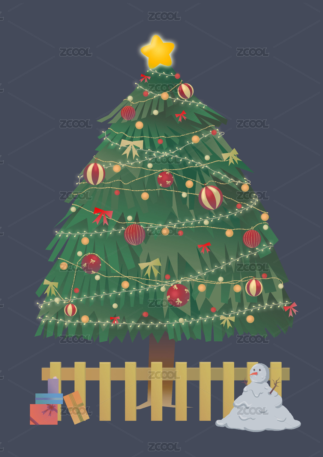 圣诞节圣诞树装饰品灯花环和礼物插画