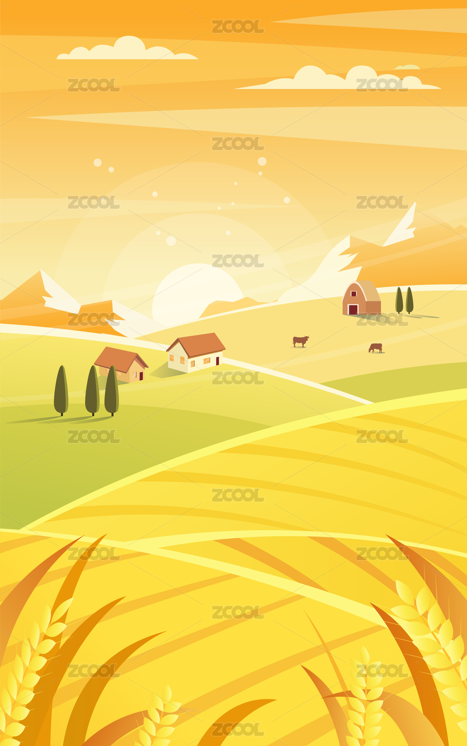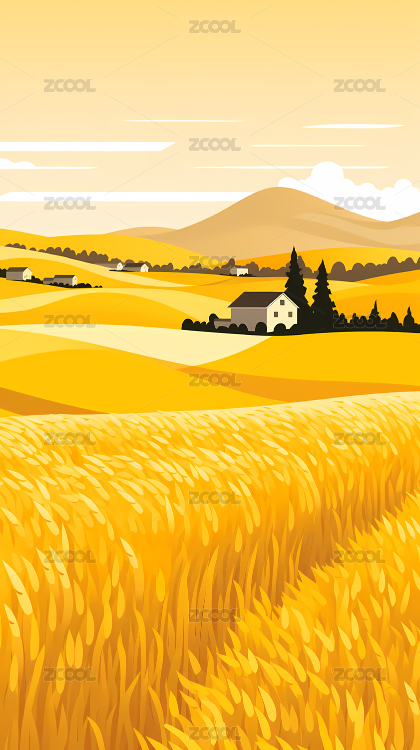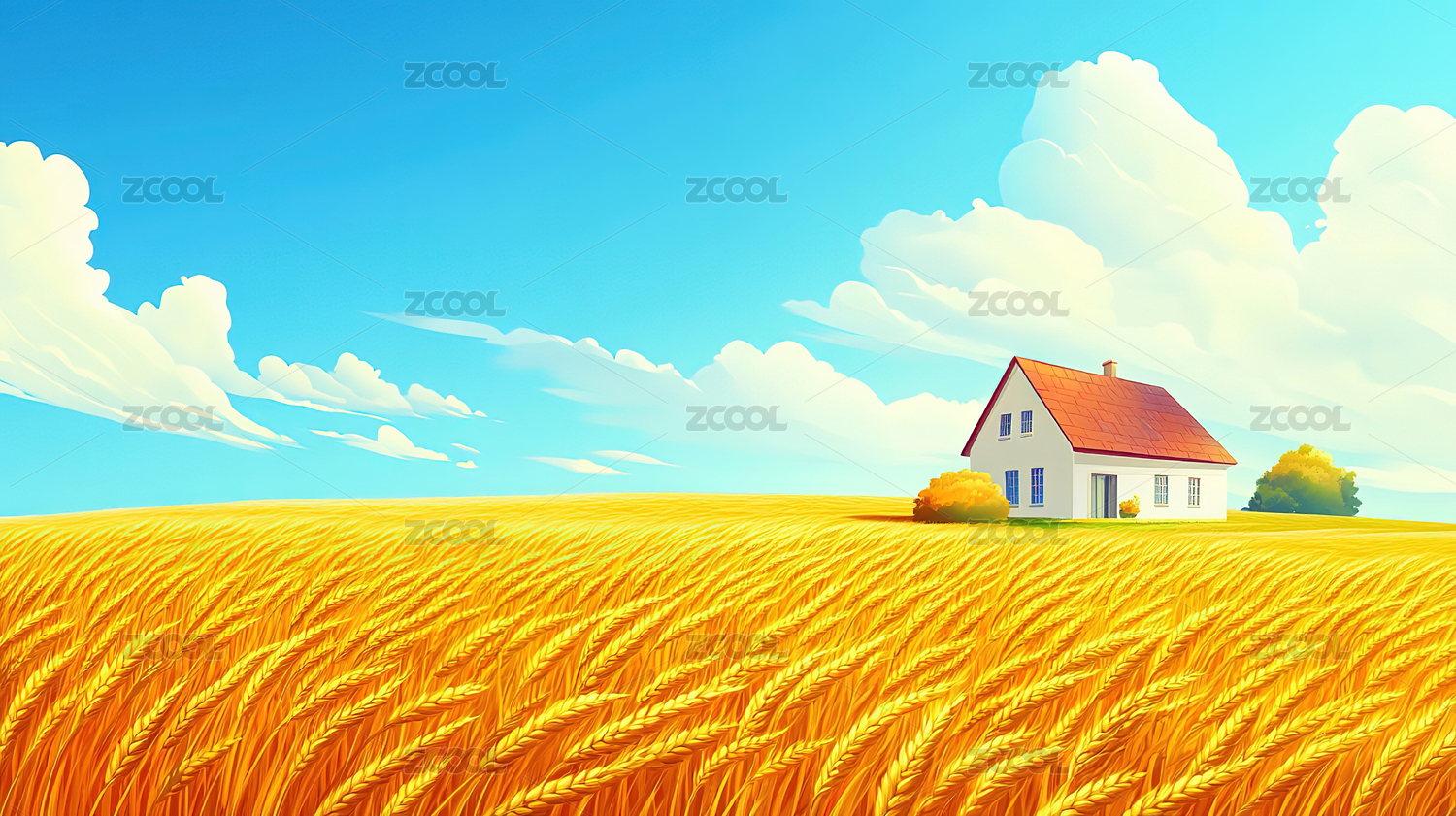 秋天丰收的金色水稻麦子与农庄蓝天白云插画